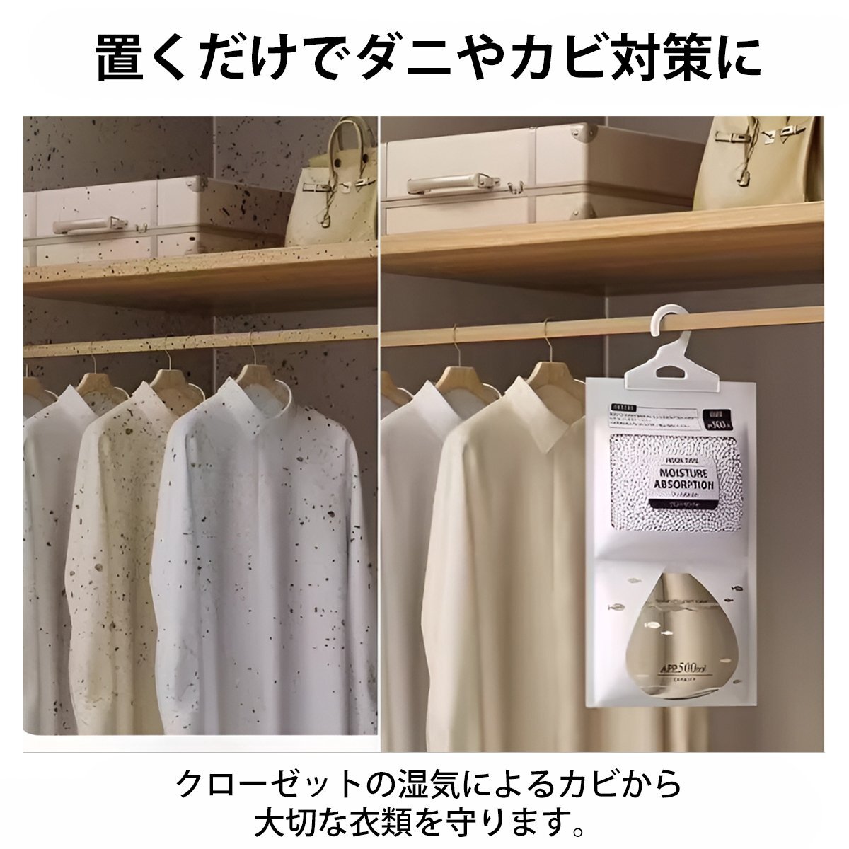 吊り下げ式 ハンガータイプの除湿剤です。 クローゼットにこもった湿気が大切な服をカビさせてしまいます。 そんな時はこの吊り下げるだけの除湿剤が活躍! 除湿剤の残量や除湿力が一目でわかる構造。吸収した湿気はパックに溜まっていきます。 最大除湿量は驚異の「500ml」 使用後は手で破いて、溜まった液体を水道水と一緒に流して捨てるだけ。 吊り下げられる箇所ならどんな場所でも使用できるミニマルで可愛いデザイン。 商品詳細 サイズ(約):高さ30cm×幅16cm 除湿量:500ml 除湿剤:250g |