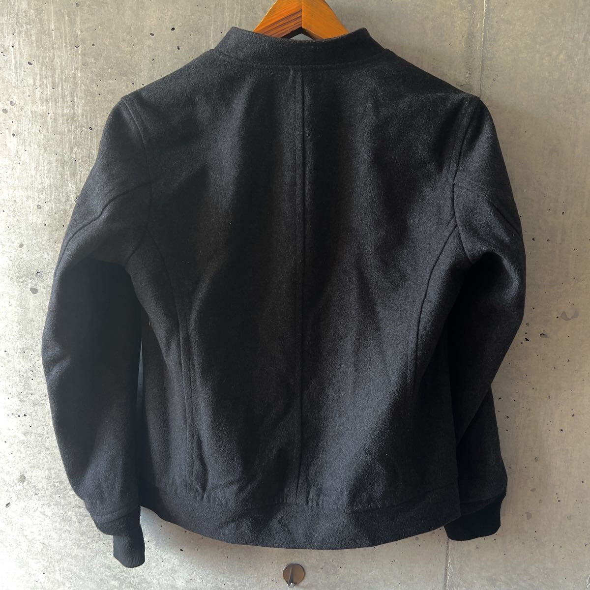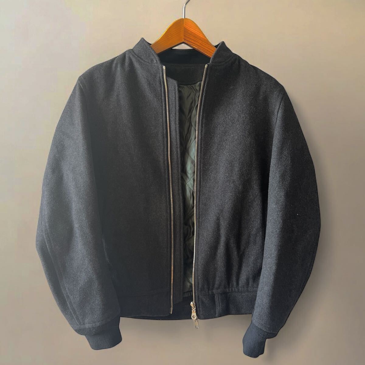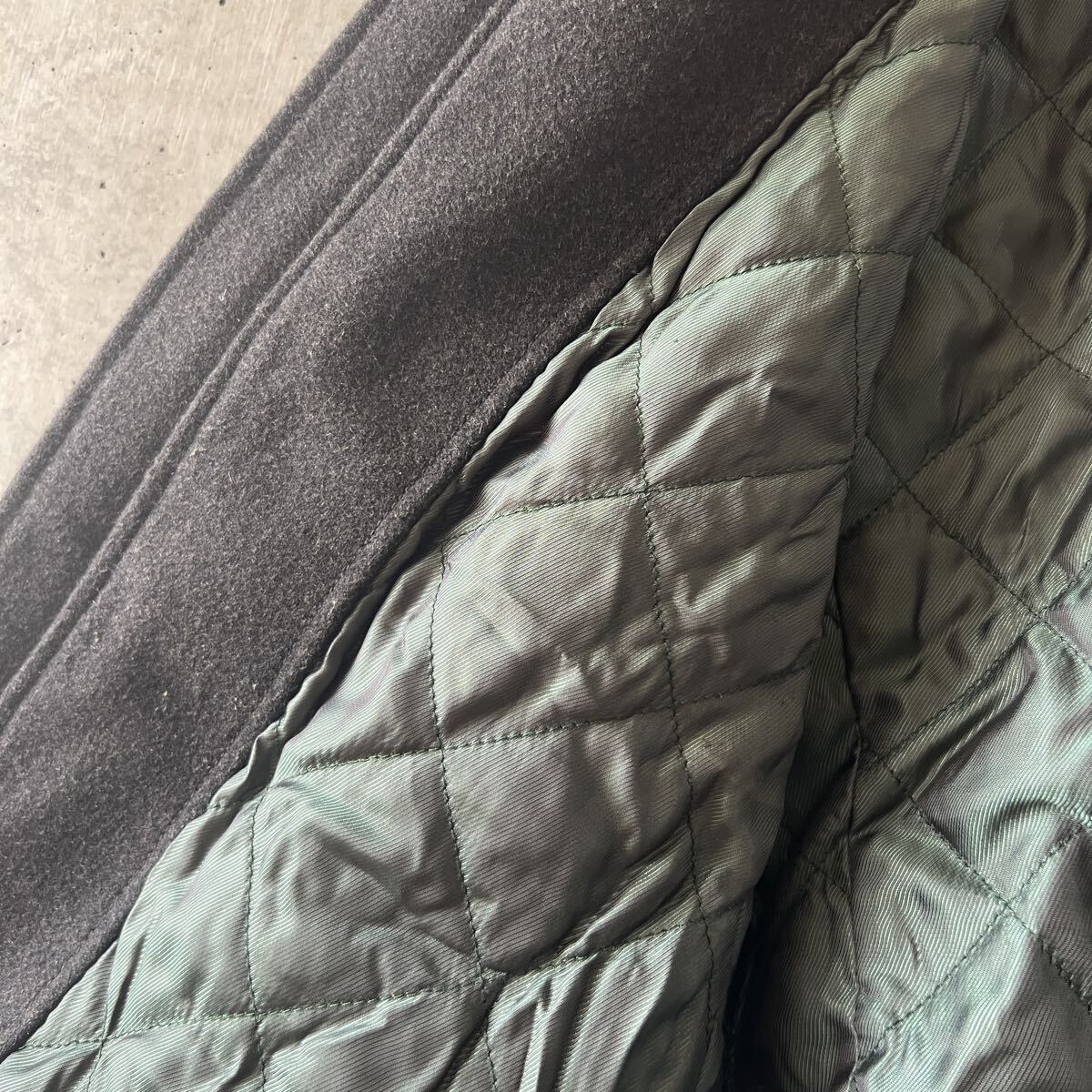 表地はウール混で滑らかな質感、内側にはグリーンのキルティング中綿を採用しており、軽量ながら暖かいアウターです。