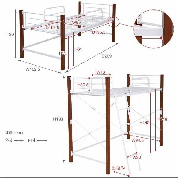 | 【カラー】 ブラック×ブラウン、ホワイト×ブラウン、ホワイト×ナチュラル、ブラック×ナチュラル 【サイズ】 <外寸> 幅102.5×奥行209×高さ183cm <内寸> (共通) 床面:幅97×奥行197.5cm サイドガード:幅73×高さ30.5cm (ミドルタイプ) 床面高さ:高さ61cm 床面下:幅94.5×奥行195.5×高さ53cm (ロフトタイプ) 床面高さ:高さ148cm 床面下:幅94.5×奥行195.5×高さ140cm はしご出幅:34cm 【材質】 フレーム:スチール(粉体塗装) 支柱:ラバーウッド(ラッカー塗装) 【耐荷重】 床面:120kg以下 【生産国】 マレーシア 【梱包】3梱包でお届けします。 3-1 サイズ:103×40×14.5cm、重量:23.5kg 3-2 サイズ:95.5×46×16cm、重量:13kg 3-3 サイズ:92.5×40.5×14cm、重量:13.5kg 【その他】 ・ミドル/ロフト組み替え可能 ・六角レンチ、スパナ同梱 ・支柱は天然木を使用しているため、商品によって色味や木目などの風合いが異なります。 【組み立て品】 お客様による組み立てが必要です。 【ご注意】 ・サイズ、重量は概算です。 ・商品カラーはご使用のモニターによって実際の明るさや色と異なって見える場合がございます。 |