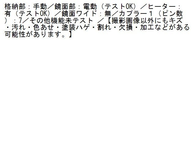 | 商品情報 | 格納部:手動/鏡面部:電動(テストOK)/ヒーター:有(テストOK)/鏡面ワイド:無/カプラー1(ピン数):7/その他機能未テスト /【撮影画像以外にもキズ・汚れ・色あせ・塗装ハゲ・割れ・欠損・加工などがある可能性があります。】 | ||