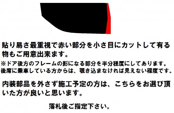 | リア3面は施工性良好ですが、ドア部分は初心者の方には少々難しいと思います。 ドア部分は通常サイズの他、貼り易さを最重視した小サイズもご用意出来ます。(画像④) 内装部品を取り外さず施工する場合、小サイズをお選び頂いた方が良いと思います。 落札後、ご指定下さい。 ※取り外し方の手順(画像付き)をお知らせさせて頂いています。 | ||