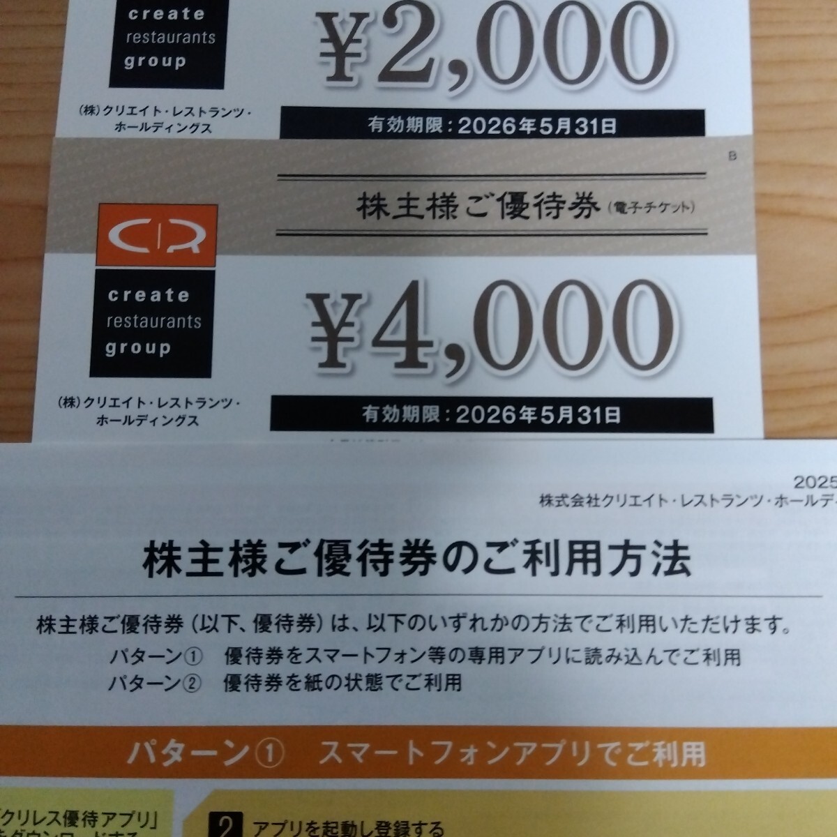 クリエイト・レストランツ・ホールディングスの株主様ご優待券、6000円分(4000円券1枚、2000円券1枚)です。| 出价者 | 信用 | 价格 | 时间 |