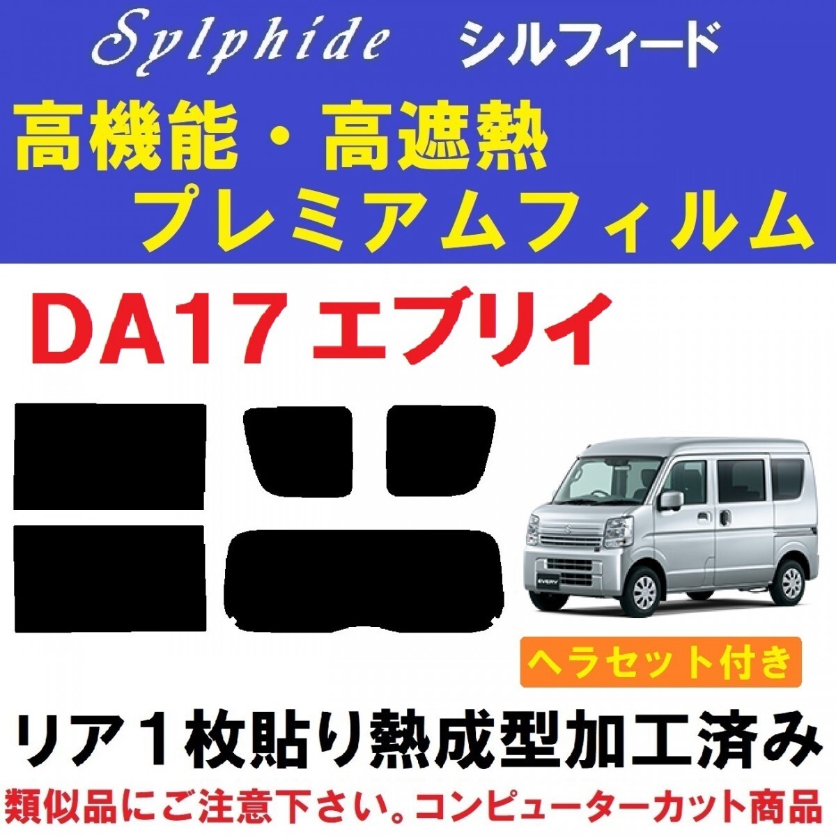 DA17エブリイ バン・ワゴン用『高機能・高断熱フィルム シルフィード使用』1枚貼り成型加工済みフィルムリア5面セットです。(専用施工液付き) ・信頼の品質と実績で永い間業務用フィルムとして選ばれ続けているIKCS製品です。 ・業務用フィルムの中で最も信頼性の高い、ベストセラー商品です。 ・詳しくはアイケーシーエス株式会社HPをご覧ください。 ※シルフィードは、ベンツ等の高級輸入車を取り扱う 全国のヤナセでも指定フィルムとして使用されている信頼性の高い商品です。 平成 27 年 3 月 ~ DA17V・DA17W、全グレードに対応出来ます。 バン・ワゴン 標準ルーフ・ハイルーフなどにより、ガラスの種類が複数有るため ご落札後お車の詳細を質問させて頂き、適合する商品をご用意させて頂きます。 ※令和6年マイナーチェンジ以降(6型~)にも適合致します。 ※適合等 ご不明な点など有りましたら、お気軽にご質問下さい。 ◇◆◇当商品には、画像2のヘラセットが付属します◇◆◇ ■滑りの良いシリコンタイプのゴムヘラ スムーズに水切り(清掃)・貼り付け後の水抜きが出来ます。 実際の業務でも色々な物を試しましたが、シンプルなこの形状・このメーカー・このグレードの物が1番使いやすいです。 柔軟性が有りガラス(フィルム)に密着するため、フィルム折れも防げます。 ■使いやすい厚みとコシの有るプラヘラ 形状は似ていても各メーカーにより硬さ・厚みなど色々と有ります。 慣れていない方でも扱い易いように少々柔らか目の物になります。 ヘラ先にはフッ素樹脂加工のクロスを貼って有りますので、滑りが良くキズを防止します。 ■ワイプオール(不織布ワイパー) 布同様の丈夫さと紙の持つ吸水性を発揮。糸くずの発生が無く均一素材のため異物混入の心配が有りません。 施工前のガラスクリーニング~施工時にフィルムが触れる可能性の有るガラスの周りのゴム部品の拭き取り清掃~吸水等に大変便利です。 全て実際の業務に使用している物で、その中から使いやすい物を選んでいます。 ヘラセットがご不用の場合、フィルムのみの商品も有ります。こちら ◇◆◇精密コンピューターカット◇◆◇ 貼りやすさを最優先に各部のサイズ・形状など微調整し、改良を重ねた独自のデータを製作。 高精度な最新・大型カッティングプロッターによるカットで正確で滑らかなカットラインを再現しています。 施工業者だからわかる、貼りやすいサイズ・形状に仕上げています。 ◇◆◇リア1枚貼り成型加工済み◇◆◇ リアガラスの湾曲に合わせて熱成型加工して有りますので、平面に貼るのと同様にたるみが出ず1枚貼り出来ます。 ※最適な状態に成型加工して有りますので、ヒートガン(ドライヤー)等は不要です。 ◇◆◇専用施工液付属◇◆◇ 軽視されがちな施工液ですが、貼りやすさに大きく関わる部分になります。中性洗剤などで代用せず、必ず付属の専用施工液をご使用下さい。 濃度については車種・季節などにより変わりますので、個別にお知らせ致します。 ☆高機能・高断熱フィルム シルフィード☆ シルフィードは、太陽エネルギーの中の赤外線を大幅にカットすることで車内の温度上昇を抑え、より快適な車内環境を実現する高性能断熱カーフィルムです。 スモークの濃さとは関係なく赤外線のカット率がほぼ一定なので、お好みの濃さのフィルムで優れた断熱効果を実感できます。 赤外線吸収率の高い金属酸化物ITO(酸化インジウムスズ)からなるセラミックを採用する事で高い遮熱効果を実現しているので、遮熱効果を求める為に真っ黒やミラーと言ったフィルムを選択する必要はありません。 透明性も高く、ハードコートでキズにも強いシルフィードは長期間にわたって持続します。 「Sylphide」シルフィードの信頼性は、ベンツなどの高級外車を取り扱う全国のヤナセで指定フィルムとしても取り扱いをされています。 ☆車内の温度を上げる要因・赤外線を大幅カット☆ 赤外線は、目に見える光ではありません。車窓から入り込む太陽光の中に含まれる赤外線は車内の温度を上げる大きな原因となっています。 光の大半を遮断する様な真っ黒なフィルムや光を反射するミラー仕様のフィルムを使わなくても、シルフィードは赤外線を90%以上も遮断して車内の温度上昇を抑えます。お好みの濃さ、お好みの色のフィルムで快適な車内環境を実現し、クリアな視界を確保できる高機能フィルムです。 ■フィルムの種類■ 可視光線透過率 3% SC-7003 可視光線透過率 7% SC-7008 可視光線透過率13% SC-7015 可視光線透過率20% SC-7020 可視光線透過率30% SC-7030 可視光線透過率46% SC-7045 ■全商品、キズに強いハードコート・紫外線(UV)カット率99% 赤外線(IR)カット率92%です。 ※可視光線透過率が低くなるほどフィルムの色は濃くなります。 サイドとリアで濃さを替えたり等、可能です。 部分的にフィルムが必要になった場合、単品販売も承ります。 他にもDA17エブリイ用フィルム、各種出品中です。こちらもご覧くだ
