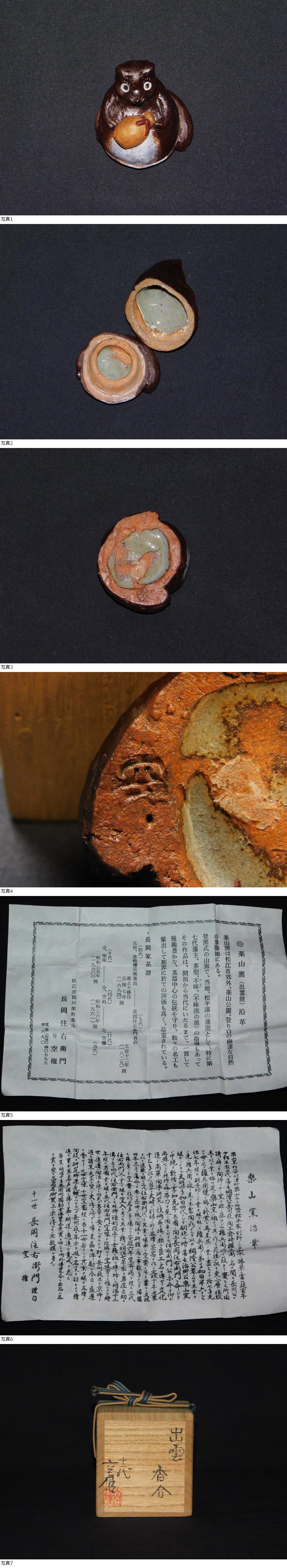 楽山焼11代長岡住右衛門(空権)作の香合 狸 出雲焼です。 一見してヒビ・カケ等ございませんが、 中古品の為、画像にてご判断の上、御入札ください。 状態は良好・美品です。 【寸法】 縦4.4㎝、巾5.1㎝、高6㎝ 【付属品】 ■箱:共箱■共布:無■作歴:有■ こちらの商品は送料無料になります。 発送は下記表を参考に佐川急便・ヤマト運輸からお選び下さい。 沖縄県に関してはヤマト運輸のみの取り扱いとなります。 また、梱包サイズが220以上の場合は佐川急便のみの取り扱いとなります。 同梱発送をご希望の場合は、ご連絡頂ければ対応させて頂きます。 只、梱包サイズが変更する場合もございます。 長岡住右衛門 (11代空権) 楽山焼11代、7代住右衛門 島根県松江市出身 師、9代空味、10代空處 1929 ( 昭和4 )~ ( 現在 ) 祖父9代空味、父10代空處から薫陶を受けて楽山焼の技法を修得。 1960年に祖父・空味、また、翌年父・空處が相次いで死去した為に 同年より7代住右衛門及び楽山焼11代目を継承し現在に至る。 作品は象嵌手の三島写、伊羅保写などを最も得意として茶陶を展開、 特に茶碗、水指、茶入に秀作を残している。 |