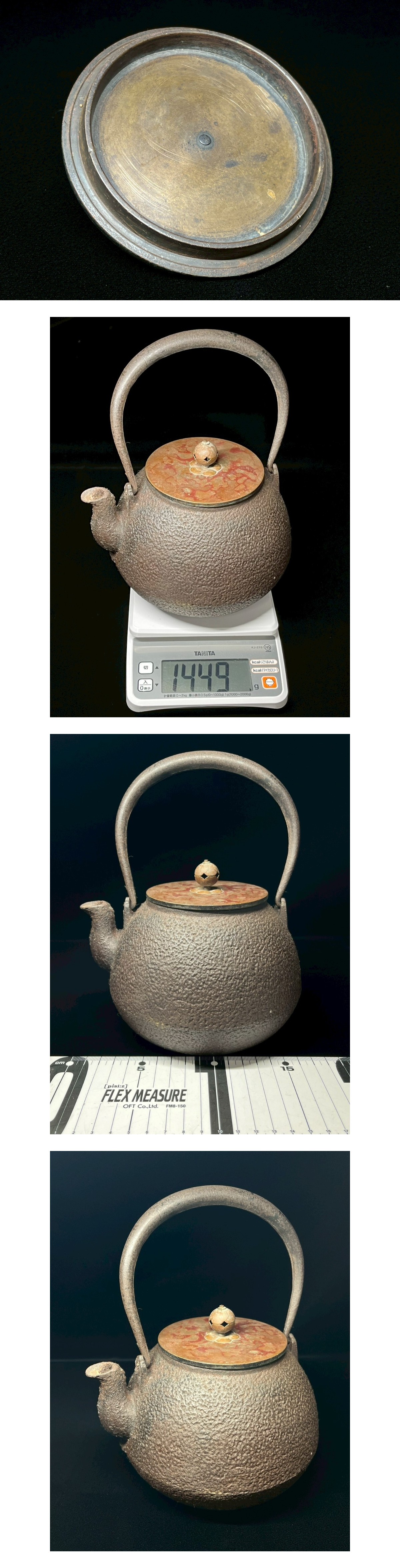 ●古美術 時代物 鉄瓶 重量1449g 銅蓋 鉄器 煎茶道具 茶注 茶器 斑紫銅 蕾摘 骨董 希少 磁石反応有 金属工芸 茶道具 蔵出 初出 ■サイズ:横幅 18cm/縦幅 15cm/高さ 23cm ■重量: 1449g ※素人寸法の為、若干の誤差はご了承ください。 ■状態につきましては経年に伴うスレ・汚れ・小キズ などが見られます。 ※その他の細かな状態は写真にてご確認・ご了承の上 ご入札くださいませ。 ●こちらの商品などは時代物や古いお品・骨董品となり ますので、細かな状態を気にされる方・神経質な方の ご入札はご遠慮くださいませ。【ZI】 |