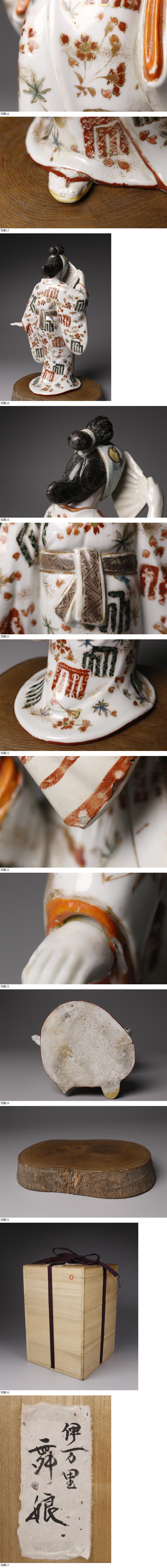 26012703 A* * * 商品詳細 * * * ここでしか出逢うことのできない唯一の美をご紹介させて頂きます。 豊かな色彩に繊細な造形、古風で趣のある古伊万里の陶器人形です。 しなやかな佇まいでたおやかに舞う様が美しく表現されており、 その姿のみならず豪華な絵付けも見事で見応えがあります。 全方向から見られることを意識した丁寧な造形も素晴らしい、 陶器人形ならではの魅力が楽しめる逸品です。 この機会に是非お求めください。 ■商品内容/人形、台座、箱 ■サイズ/横15cm×高27cm×奥行11.5㎝ 箱:横20cm×高29cm ■状態/スレ、キズ、釉薬にヒビ、剥げ、直し、汚れ、 台座に割れ、箱にスレ、キズ、ヤケ、シミ、へこみがございます。 ※写真にてご確認、ご了承の上ご入札下さい。 * * * 支払詳細 * * * !かんたん決済 * * * 発送詳細 * * * 入金確認後3営業日以内に発送致します。 ※直接引き取りも可能です。 60~160サイズにつきましては 佐川急便、ゆうパックのどちらかで発送いたします。 ゆうパック発送の場合、弊社の発送日から追跡サービスに問合せ番号が反映されるまで 約1日ほどお時間がかかりますのでご了承下さい。 * * * 注意事項 * * * 運送中の破損があった場合は速やかに当社までご連絡下さい。 保険を利用するのに受取連絡後に運送会社による現場での破損状況確認が必要となります。 勝手に返送されますと保険の適用外となりますのでご注意ください。 * * * * * * お問い合わせ:082-236-8669 |