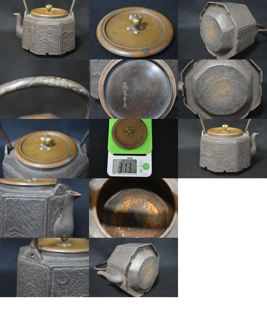 【光成】龍文堂造「金銀象嵌堤手・黄銅蓋・八景紋・鉄瓶」水漏無・蓋313g