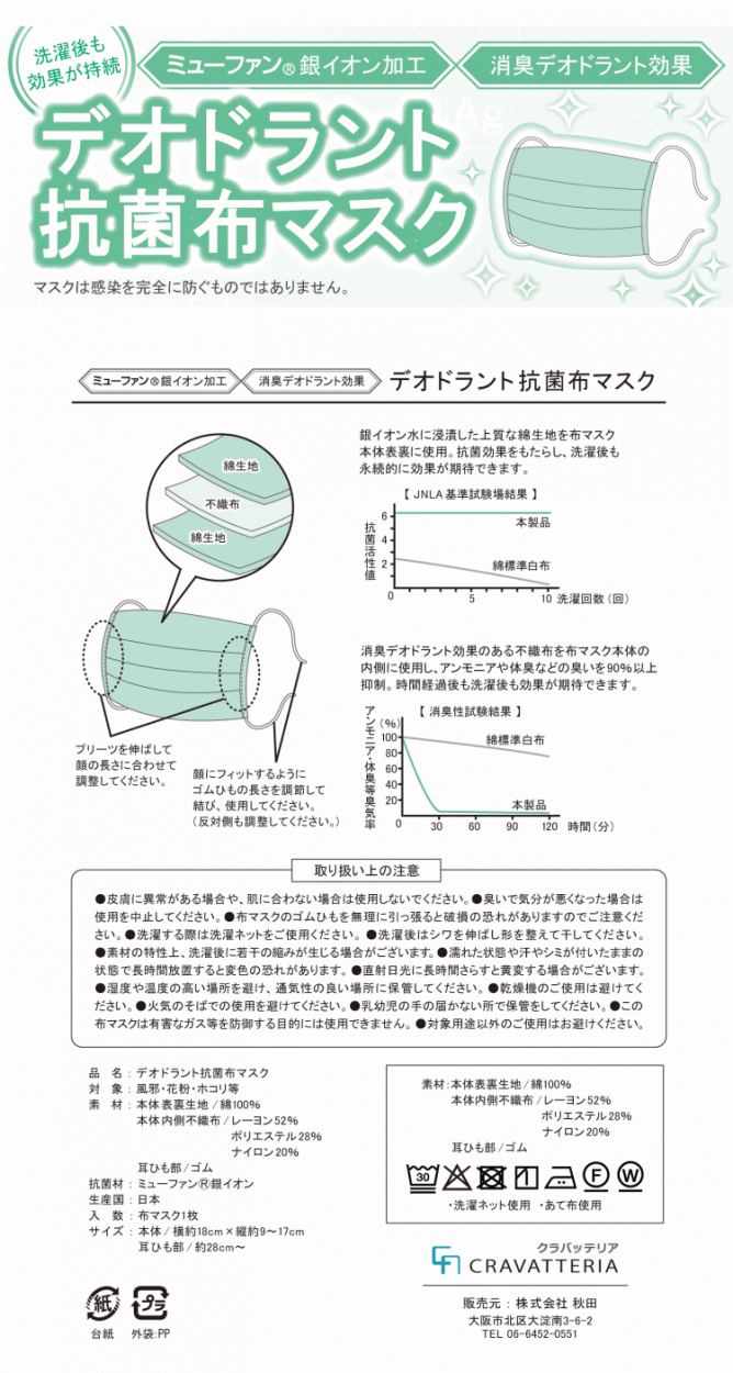 | 素材 | 本体:綿100% 本体内側不織布:レーヨン52% ポリエステル28% ナイロン20% 耳掛け部:ゴム素材 |