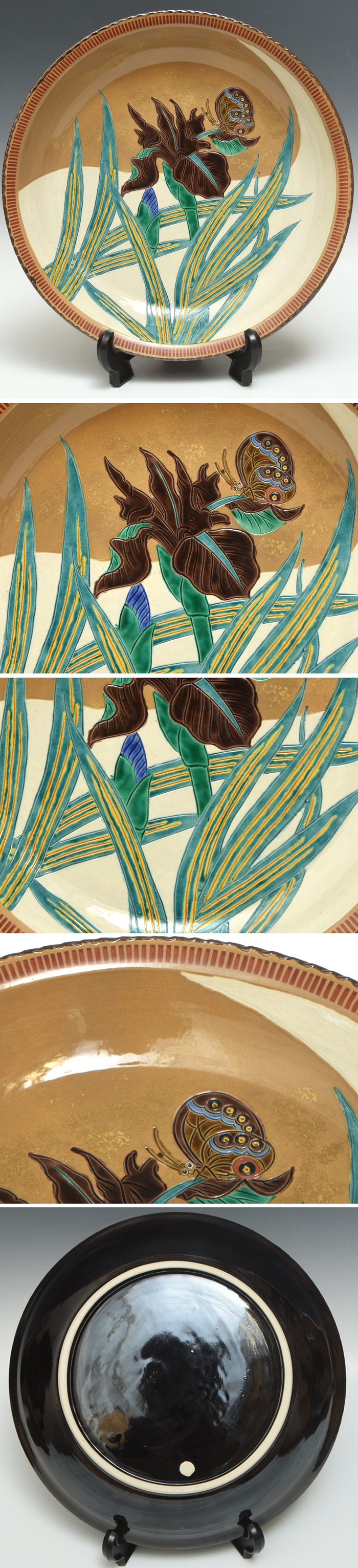 玄窯 東影明 号翠明(造)花鳥文飾皿です。 菖蒲と蝶が色絵で施された品物です。 汚損破損なく美品です。 高台内に印銘「翠明」あり。 ※予めご了承の上ご入札お待ちしております。 ※撮影の際に生じた写り込みなどがございます。 ご理解の程よろしくお願い致します。 |