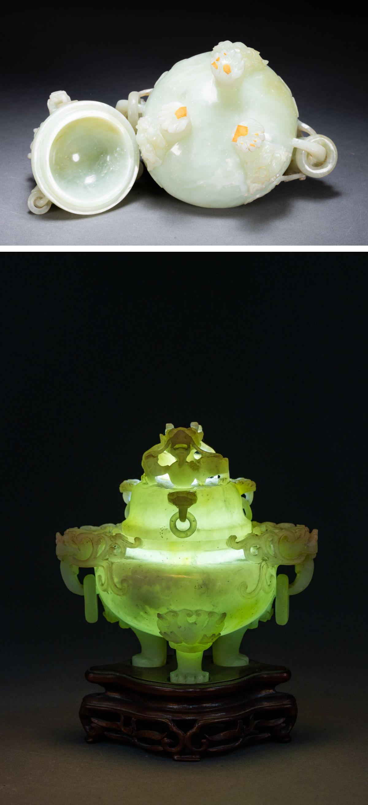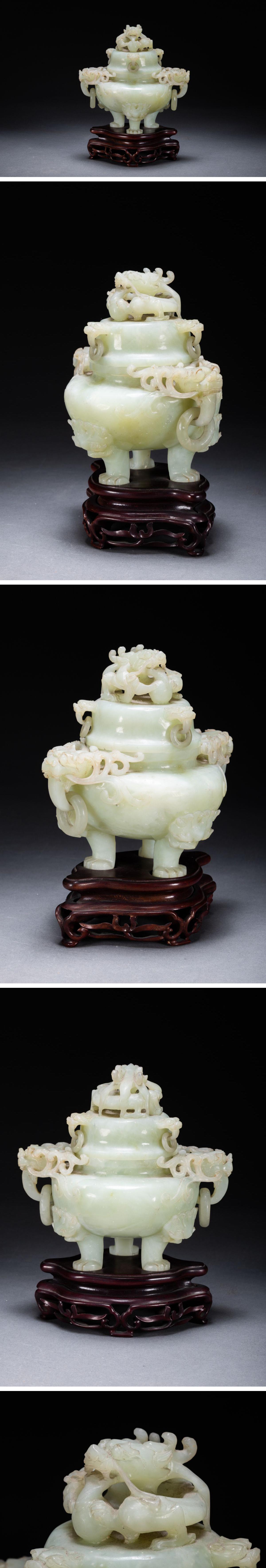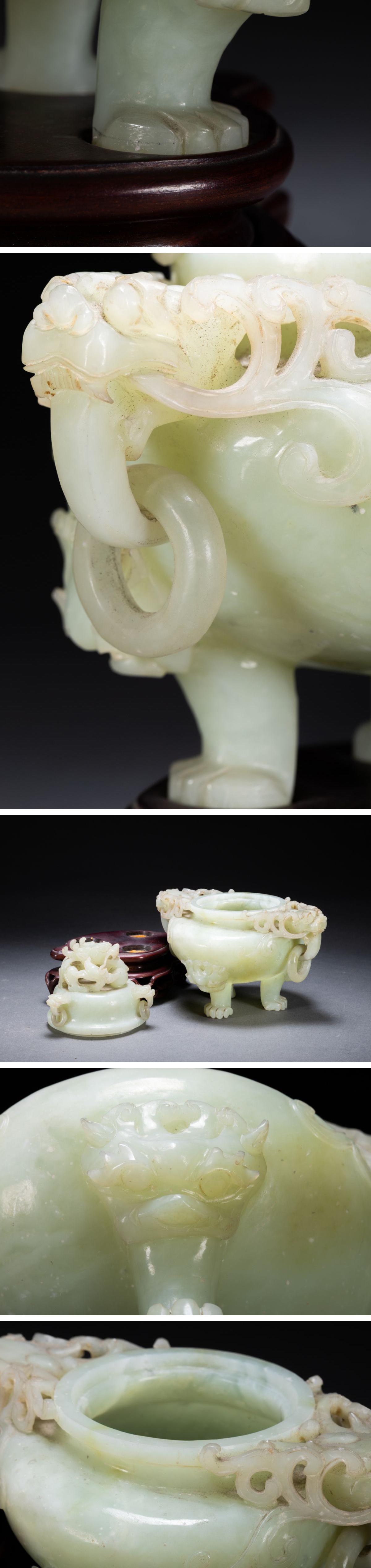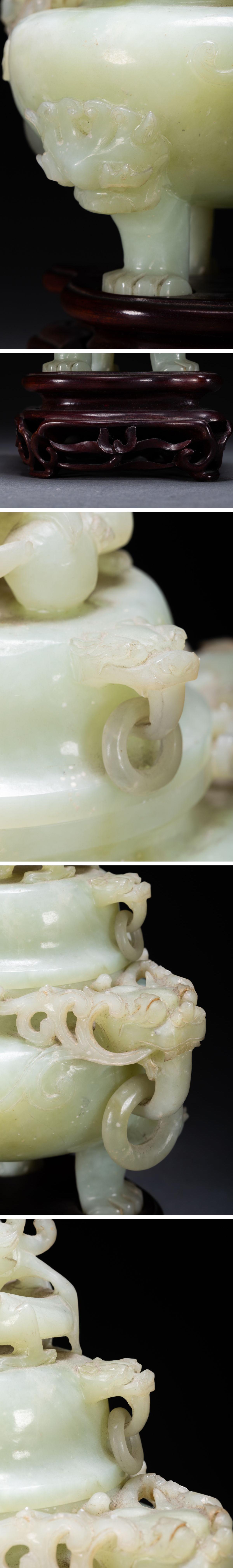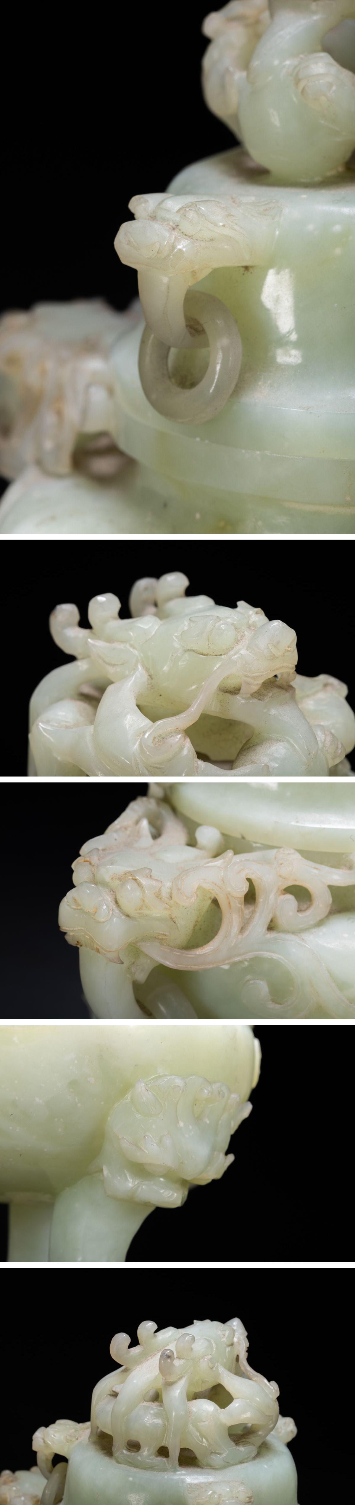 【雲錦】1円から 時代物 天然碧玉 透かし彫り 双龍文香爐案頭置物 材質保証 古美術 骨董品8L1-130S1