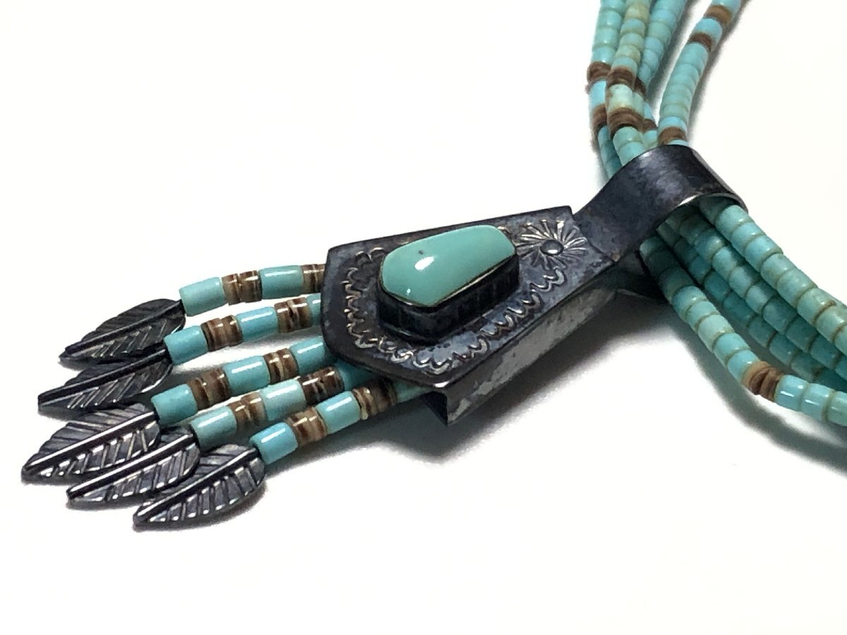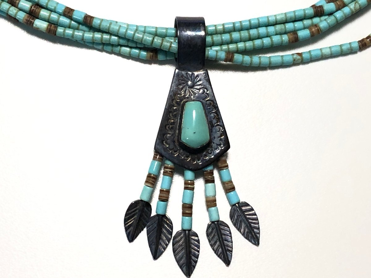 インディアンジュエリーのターコイズ、シェル、STERLING SILVERを使用した、ヒシデザインの5連ペンダントネックレスです。作者、CHRISTIN WOLF(クリスティン ウルフ)の刻印とSTERLINGの刻印があります。状態良好、ケース付属です。| 出价者 | 信用 | 价格 | 时间 |
