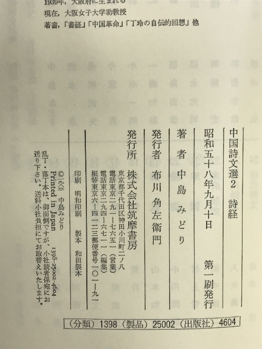 | 詩経 (1983年) (中国詩文選〈2〉) 筑摩書房 中島 みどり | ||||