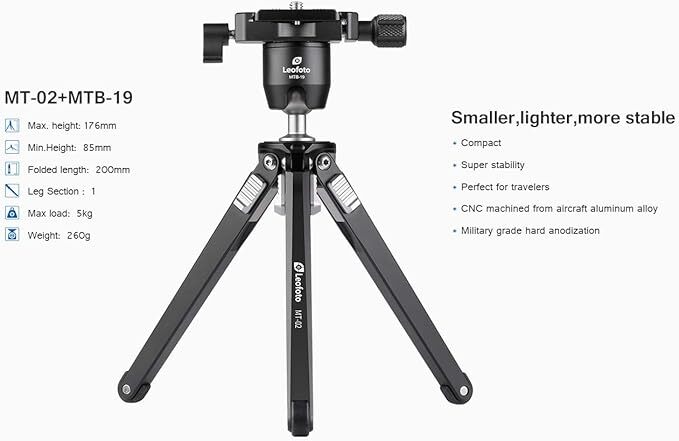 | Leofoto レオフォト MT-02 + MTB-19 ミニテーブル三脚とボールヘッド デジタル一眼レフおよびiPhone写真用プレート付き | |||