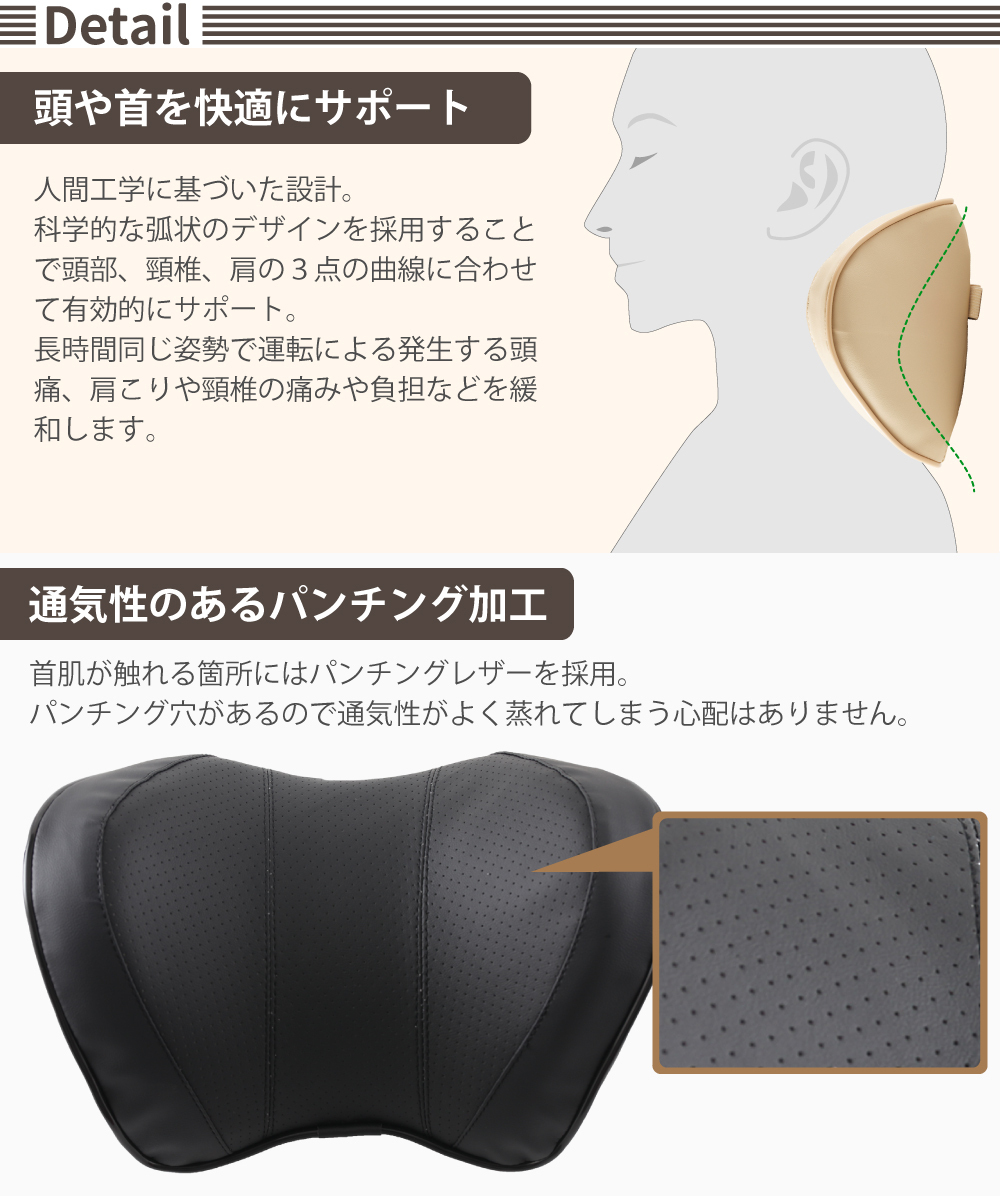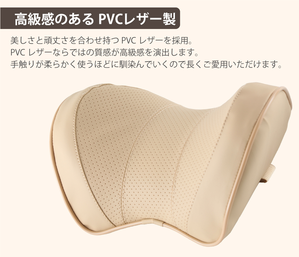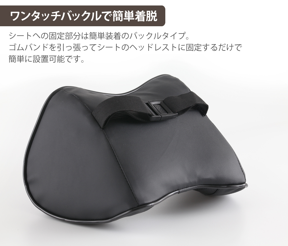 | パンチングレザー仕様 ヘッドレスト レザーネックパッド 長時間ドライブの疲れを軽減! シートに簡単に取り付け可能なネックピロー。 =Detail= 【高級感のあるPVCレザー製】 美しさと頑丈さを合わせ持つPVCレザーを採用。 PVCレザーならではの質感が高級感を演出します。 手触りが柔らかく使うほどに馴染んでいくので長くご愛用いただけます。 【頭や首を快適にサポート】 人間工学に基づいた設計。 科学的な弧状のデザインを採用することで頭部、頸椎、肩の3点の曲線に合わせて有効的にサポート。 長時間同じ姿勢で運転による発生する頭痛、肩こりや頸椎の痛みや負担などを緩和します。 【通気性のあるパンチング加工】 首肌が触れる箇所にはパンチングレザーを採用。 パンチング穴があるので通気性がよく蒸れてしまう心配はありません。 【ワンタッチバックルで簡単着脱】 シートへの固定部分は簡単装着のバックルタイプ。 ゴムバンドを引っ張ってシートのヘッドレストに固定するだけで簡単に設置可能です。 | |