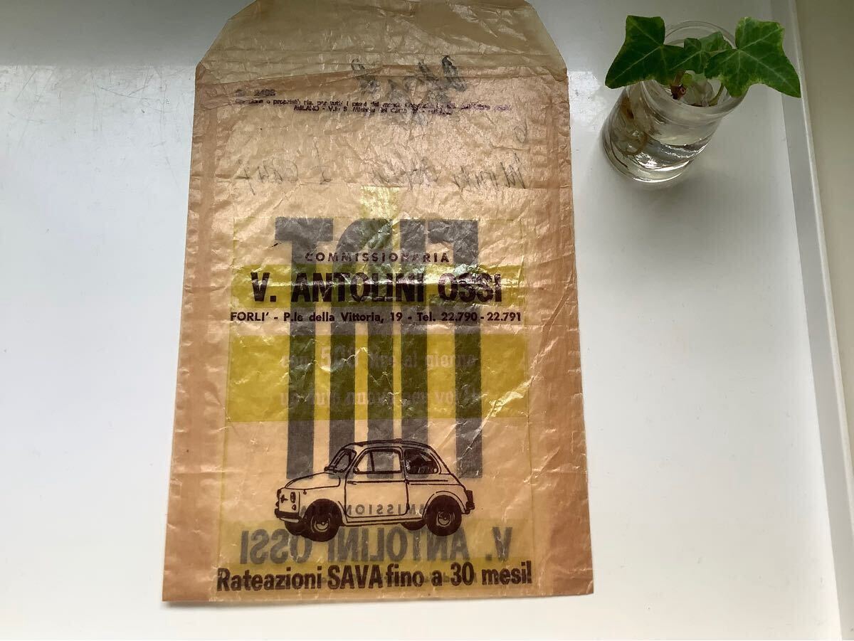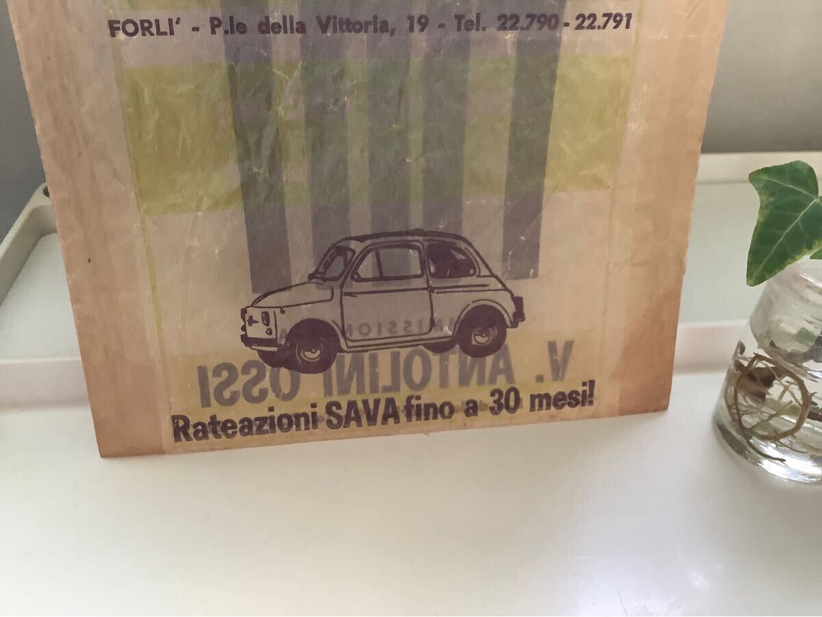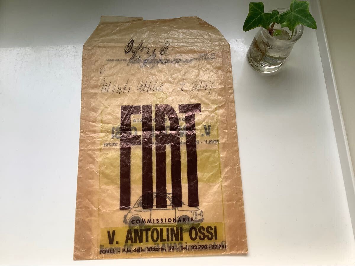 イタリア蚤の市で見つけた物で、おそらく60~70年代のフィアット地方(FORLI)ディーラー代理店で使われていた封筒かと思います。W135×H185、薄紙、イタリア人の落書き/折れ/僅かな破れあり。