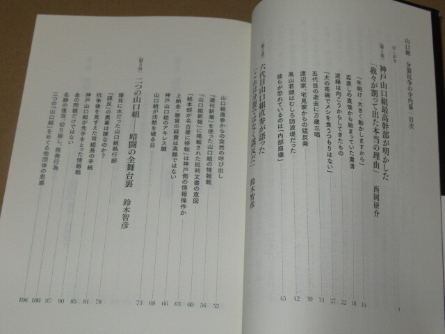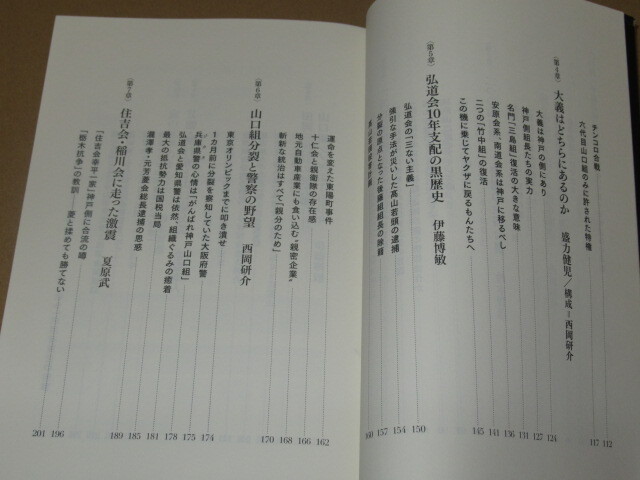 他にも山口組直参幹部の痛烈な批判、二つの山口組誕生後の暗闘全舞台裏、ベストセラー『鎮魂 さらば、愛しの山口組』(宝島社刊)の著者・盛力健児元六代目山口組盛力会会長の 「大義はどちらにあるのか?」、住吉会、稲川会をはじめとする関東の指定暴力団に走った激震の内実、 そして警察当局が思い描く六代目山口組の中核組織「弘道会」のあらたな壊滅スキーム…… 二つの山口組と全国の指定暴力団、そして警察が絡んだ暗闘の内幕を初めて明かす。