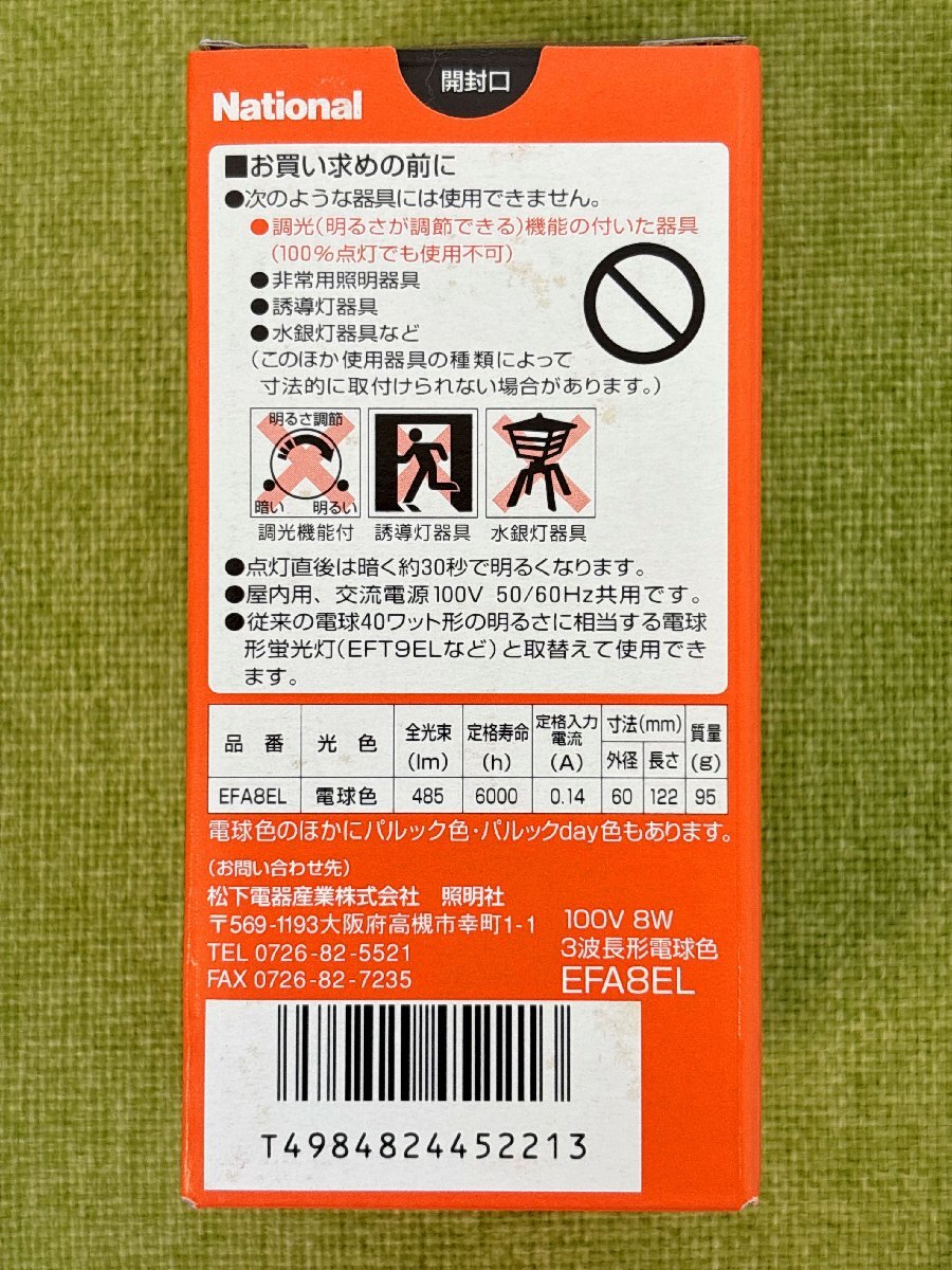 ■メーカー National(現Panasonic) ■品名 パルックボールYOU ■型番 EFA8EL ■口金 E26 ■光色 電球色 ■全光束 485lm ■定格寿命 約6000時間 ■定格入力電流 0.14 A ■寸法 外径60 mm 長さ122 mm ■質量 95 g ■明るさ 40 形 ■備考 以下の機器は非対応です。 ・調光機能の付いた器具(100%でも不可) ・非常用照明器具 ・誘導灯器具 ・水銀灯器具等