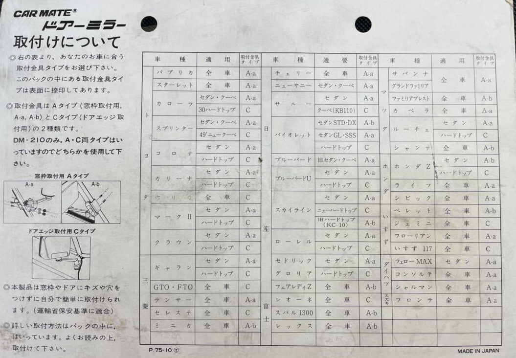 ご覧下さいまして有り難うございます 片方のみ カーメイト汎用ドアミラーの出品です 汎用ですので 多数の自動車に使えるかと思います 画像の8枚目では取付け説明書が出てますが実際には有りませんので ご了承下さい 送料600円で発送します 画像をご覧になり必要な方お決まりの3Nでお願い致します