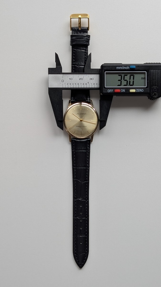 ゴールドフェザーは名前の通り、羽のように軽くて薄い時計です。当時のキャッチフレーズは「世界一薄い中三針腕時計」「機械の厚さわずか2.95mm」「フェザータッチ」 、標準のモデルが4mm前後でしたので、中三針時計としては驚異的な薄さを誇りました。