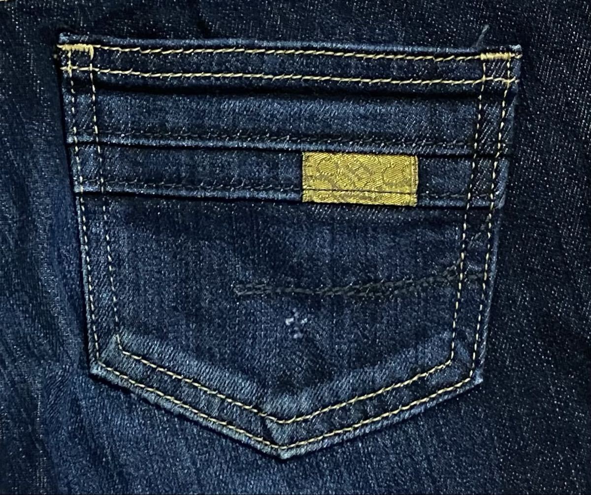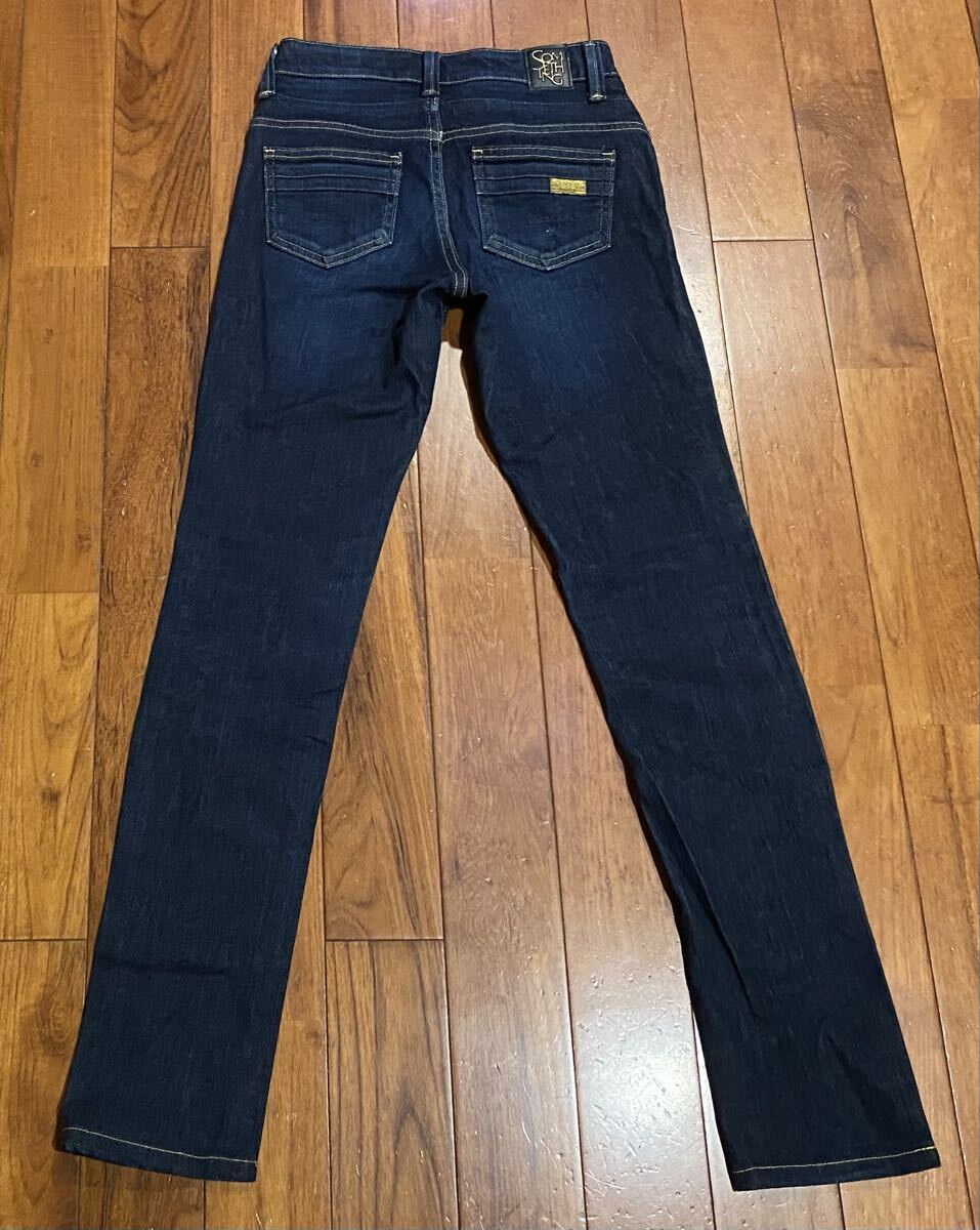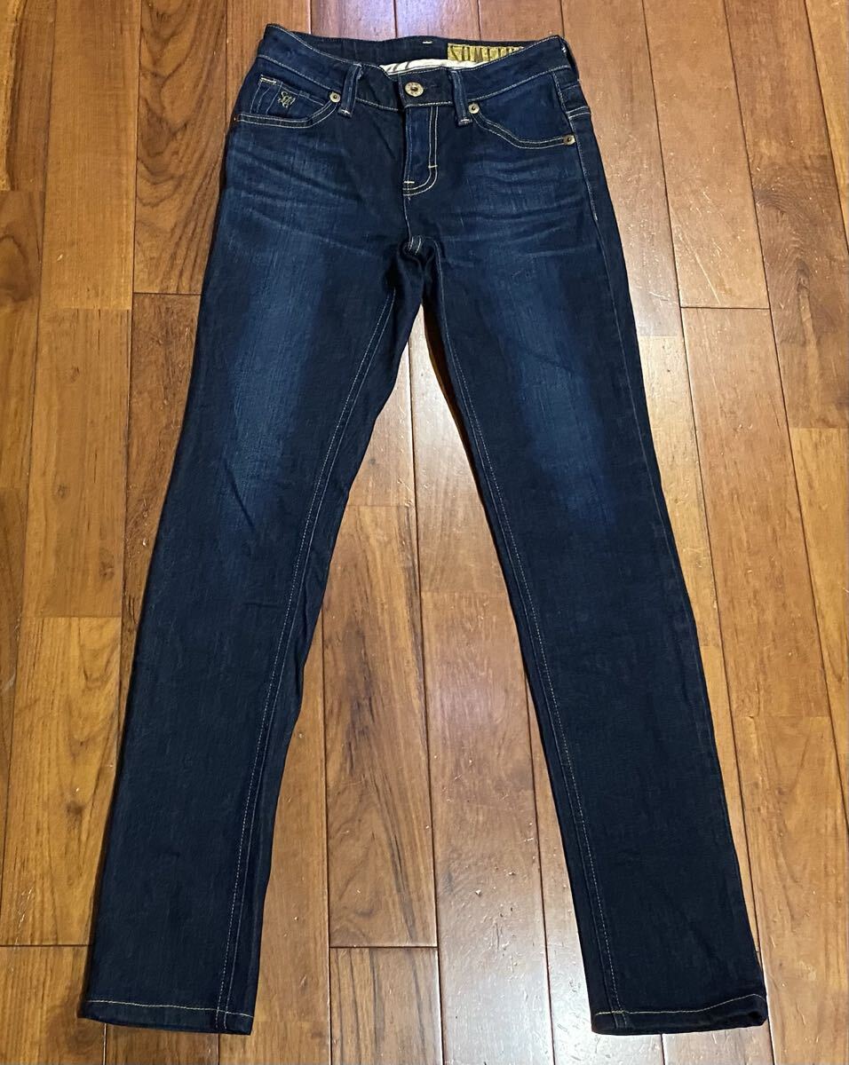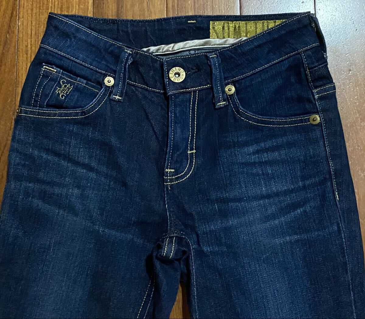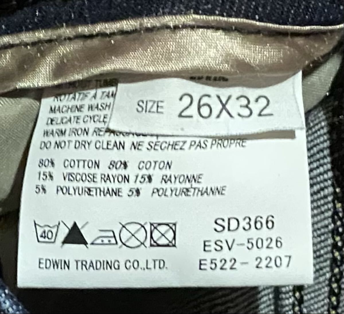 サムシングのストレッチスキニーデニム(ジーンズ)、SD366 ESV-5026 E522-2207です。色はインディゴブルーです。USEDで裾直ししております。右後ろポケット部分に少しダメージありますがその他の状態は良いです(10段階中7程度)。ジッパーフライです。生地はストレッチ入りで綿80%、レーヨン15%、ポリウレタン5%です。正規品です((株)エドウィン商事、日本製)。サイズはW26でウエストは重ねずに平置きで約65cm、ヒップ約81cm、股上約21cm、股下約75cm、股下15cmのふともも部分約41cm、裾まわり約29cm、重量約470gです。発送はゆうパケットポストになります。