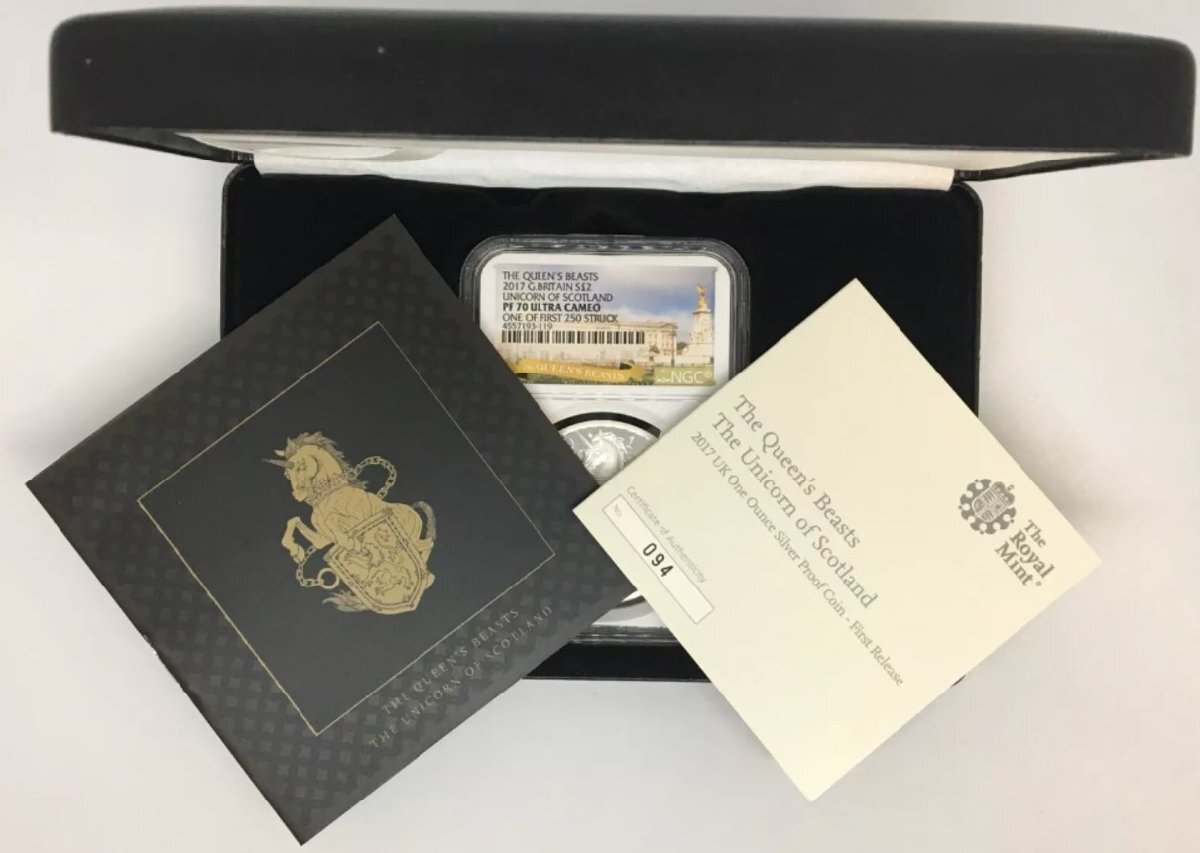 2017年 英国 クイーンズビースト 2ポンド ユニコーン銀貨 1オンス NGC最高鑑定 PF70 ウルトラカメオ 初期250枚ロット 特別ラベル
