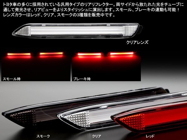 トヨタ車の多くに採用されている汎用タイプのリアリフレクター。 両サイドから放たれた光をチューブに通して発光させ、リアビューをよりスタイリッシュに演出します。 スモール、ブレーキの連動も可能! レンズカラーはレッド、クリア、スモークの3種類を販売中です。 出品はスモークです。 他のカラーは⇒ こちら ◆適合車種 SAI/サイ AZK10 全グレード 20系アルファード Sグレード 30系アルファード X/G/GFグレード 110系イスト 全グレード 10系ウィッシュ 後期のみ 20系ウィッシュ Zグレード 20系ヴェルファイア Zグレード 30系ヴェルファイア X/G/GFグレード 110系 ヴェロッサ 全グレード 70系ヴォクシー Z/ZSグレード 70系ノア S/SI 10系ハリアー 全グレード 60系ハリアー 全グレード 130系 マークX ※記載車種以外にも適合します。 LEDを内蔵しているため、純正品より厚みがございます。 反射機能がないため、車検には通りません。 別途、反射テープをご用意下さい。 輸入品のため、防水処理後のご使用をお勧めします。 |