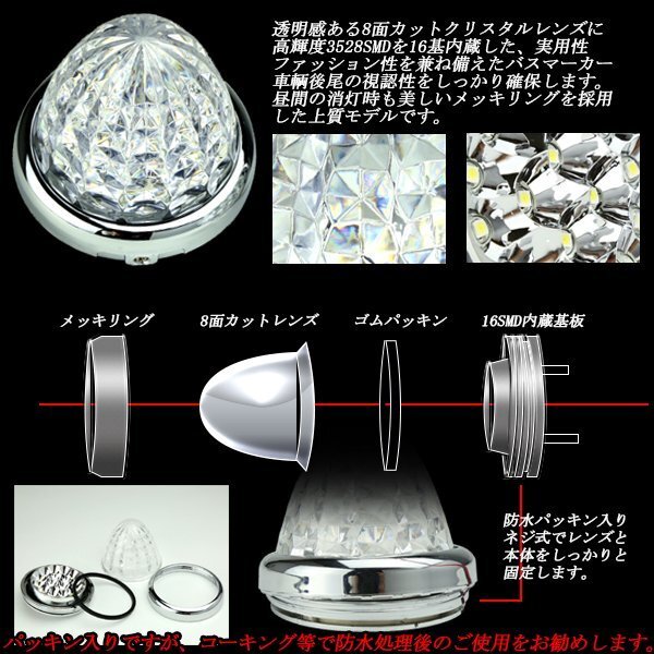 実用性・ファッション性を兼ね備えたバスマーカー 車輌後尾の視認性をしっかり確保します。 昼間の消灯時も美しいメッキリングを採用した上質モデルです。 白・橙・赤・青・緑の5色販売中! ※出品はタイトルのカラーです。数量1で1個の販売です。 同梱数量に関わらず、1個分の送料でお届けします。 他のカラーは ⇒ こちら その他、トラック用品は ⇒ こちら 防水パッキン入りですが、コーキング等で防水処理後のご使用をお勧めします。 |