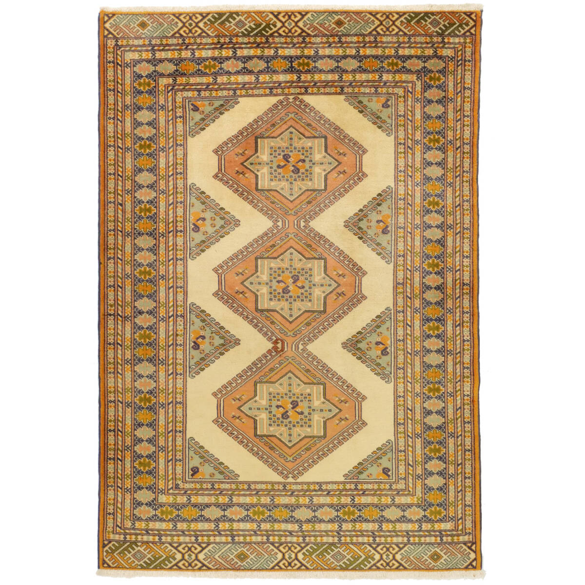 生成りをベースに、優しいオレンジや黄色、落ち着いた青や緑が調和し、柔らかな光の中に民族の個性が浮かび上がる美しい配色です。