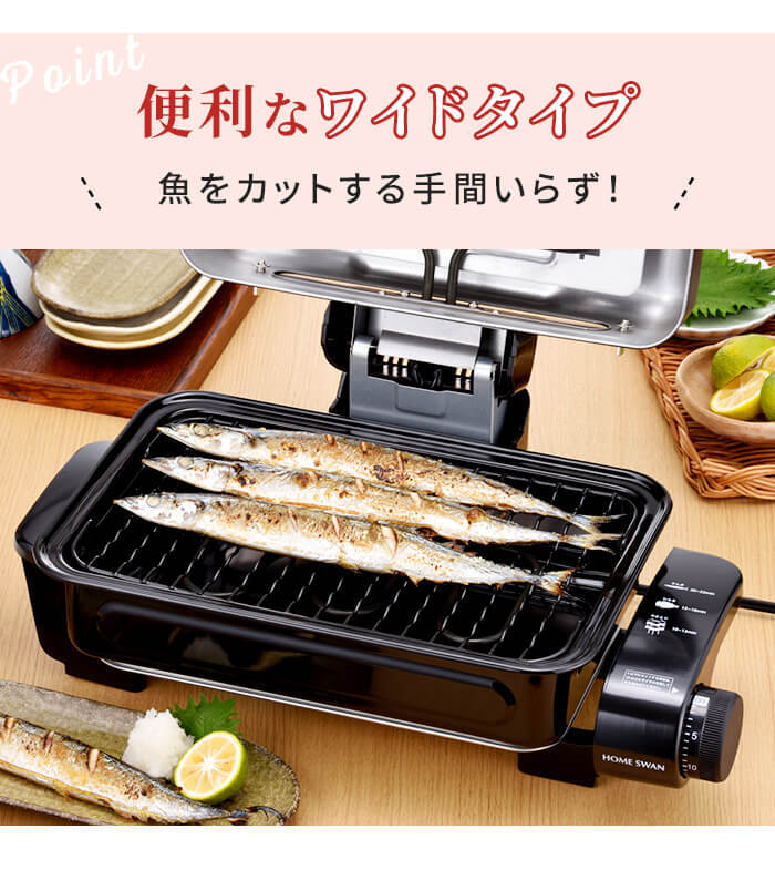 | さんま4匹が焼けるフィッシュロースター。 裏返し不要の上下ヒーター。 焼き網の裏表で高さを変えることができます。 30分まで対応タイマー付き。 ニオイを軽減する消臭フィルター付き。 分解できて水洗いOK。(※ヒーター部除く) |