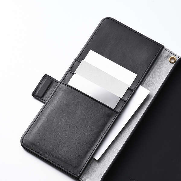 | ●フラップの内側に、メモやカードなどが収納できるポケットが4つ付いています。 カードを出し入れすることなく、そのままICカードを使用可能 | |