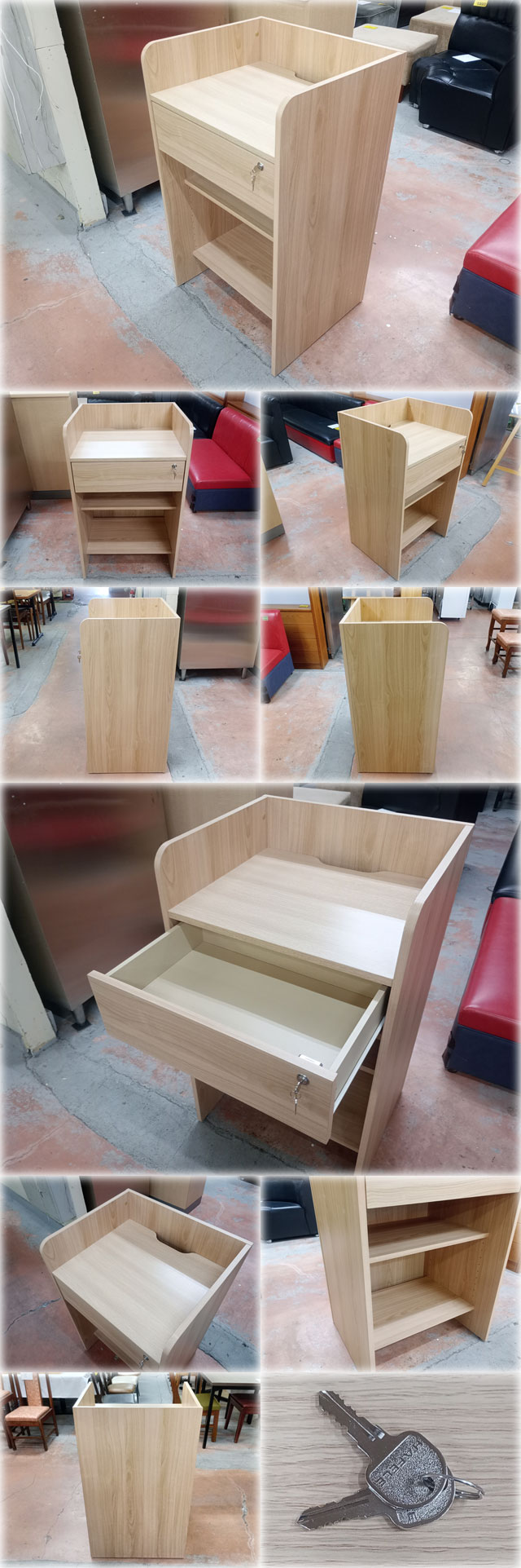 レジ台(レジカウンター) を出品いたします。 ■特徴■ シンプルなレジ台(レジカウンター)です。 天面中央に配線孔があり、 綺麗な配線処理が可能です。 引出しにはカギ付です。 あらゆる空間になじむ 明るい木目調です。 目立った大きな傷みはなく キレイな状態です。 写真に写っている周りのものは付属しません。 発送はアート家財おまかせ便でお送りします。 新品ですと2万円前後の商品です。 格安出品いたしますのでこの機会をお見逃しなく! |