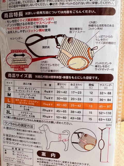 | * 商品説明 * ◆定価4048円の商品 シニア期~介護期の愛犬をやさしくケアするおむつパンツ。 着脱が簡単な面ファスナー、ずれを防ぐサスペンダー付き。 通気性、伸縮性にすぐれたコットン素材で、パッド装着部分の内側に防水加工を施してあります。 足まわりはサイドギャザー、しっぽ穴にはモレを防ぐ調節紐付きです。 Lサイズ 体重15kgまで 腰回り40~60㎝ 後ろ足まわり25~42㎝ 腰幅13㎝ サスペンダー 45~87㎝ ※商品重量約178g 未使用新品ですが紙パッケージに色褪せがある場合があります。 処分品とご理解の上ノークレームノーリターンでお願いします。 | ||||||||