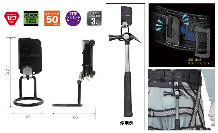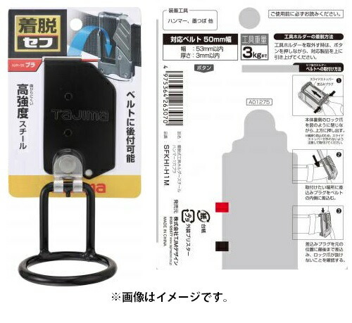 タジマ TAJIMA品番流通コードSFKHI-H1M製品情報製品重量:200g特長●現場要求強度を十分満たした頼れるスチール製●ダブルコーティングで着脱を繰り返しても安心なしっかりとした嵌合部●後付もでき、ベルトを外さずに腰周りの組み換えがカンタン着脱式●激しい動きにも横スベリしないスライドストッパー付●体の動きを邪魔しない自在ジョイントを採用。工具は重力で回転するため落下しにくい仕様●ベルトサイズ:幅53mm以内、厚み3mm以内●セフ取付工具総重量:3.0kg以下●装着工具:ハンマー、墨つぼ材質●スチール
