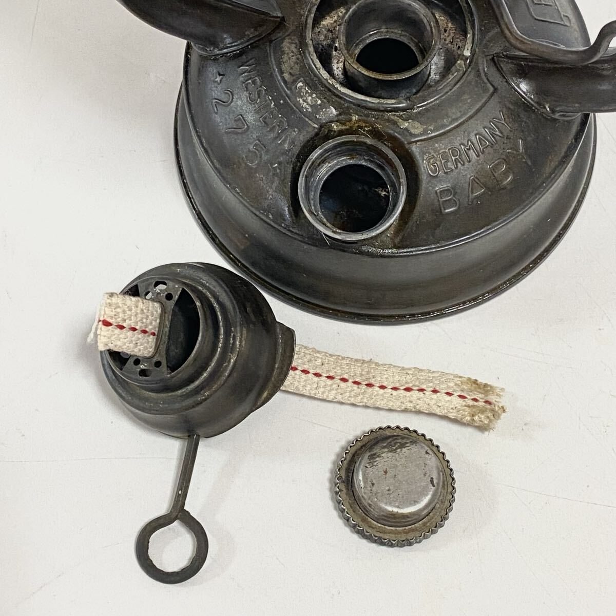 ご覧いただきありがとうございます。 1902 年創業のドイツの老舗ランタンメーカーFeuerhand(フュアーハンド)社の、ハリケーンランタンです。 stkとはSturmkappe(風防)の略称。風防付きのモデルです。 276のstkは多く出回っていますが、275のstkは滅多に出回らないとてもレアな個体です。 DBPとは特許取得を示しており、この刻印がある製造時期は1950年代後半〜1960年代半ばとされおり、希少性が高くなっています。 ホヤについても、希少なAUER社製です。 【状態】 ・目立ったへこみ・変形はありません。 ・芯の上下、バーナー部脱着、燃料キャップの脱着、リフターの上下、問題ありません。 ・タンクの漏れはありません。 ・ホヤの欠けはありません。 【サイズ】高さ 約25cm(フュアーハンド276より1cm小さい) | ||