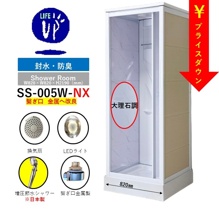 ・『サイズ』 幅820mm×奥行き820mm×高さ2160mm ・他社には無い、コンパクトサイズになっています。 ・据え置き型(組み立て式) ・ホース繋ぎ口が、金属製に改良されました。 ・シャワーユニット部分材質 アクリル ・両サイドに大理石調の樹脂パネル使用 ・正面ドアは半透明樹脂(ポリスチレン)パネルを使用。(扉は内側スライド式)のため、ドアの開閉は左右どちらとも取り付け可能です。 ・カラーは上記写真でお確かめください。(写真の写りにより若干商品の色と異なる場合がございます。) ・増圧節水ハンドシャワー (日本製) ・LEDライト・換気扇 付き ※ルームライト・換気扇付属(別途ダクトの取り付けが必要になります) ・防水アース付きコンセント単相100V ・施工の際は必ず全ての接合部防水処理を行って下さい。 また電源コンセント、床などは必ず防水加工を施した場所に設置してください。 ・お湯、水の給水管・シャワーヘッド・シャワーホース・排水パイプはサービス品としてお付けします。(付属品を使用なさらない方は、お近くのホームセンターなどでも購入できます) ・取り付け本体図面、組立て説明書は御用意いたします。 ・2~4時間程度で設置可能(人員2名 コーキング作業を除く) ・給湯器等は施工業者様とご相談下さい。 ・2世帯住宅のセカンドバスルーム・エステサロン・スポーツジム等に最適です。 | ||||||||||||||||