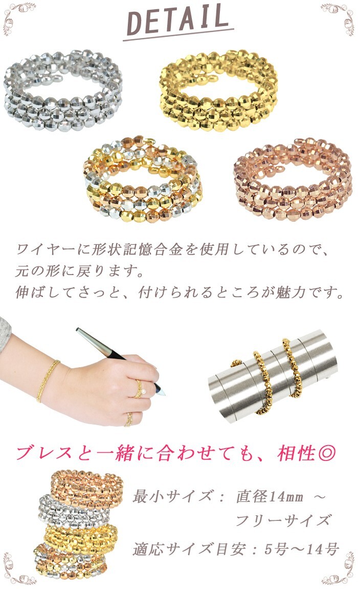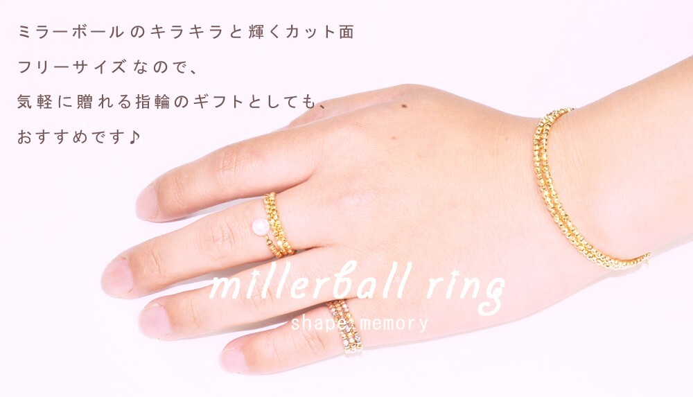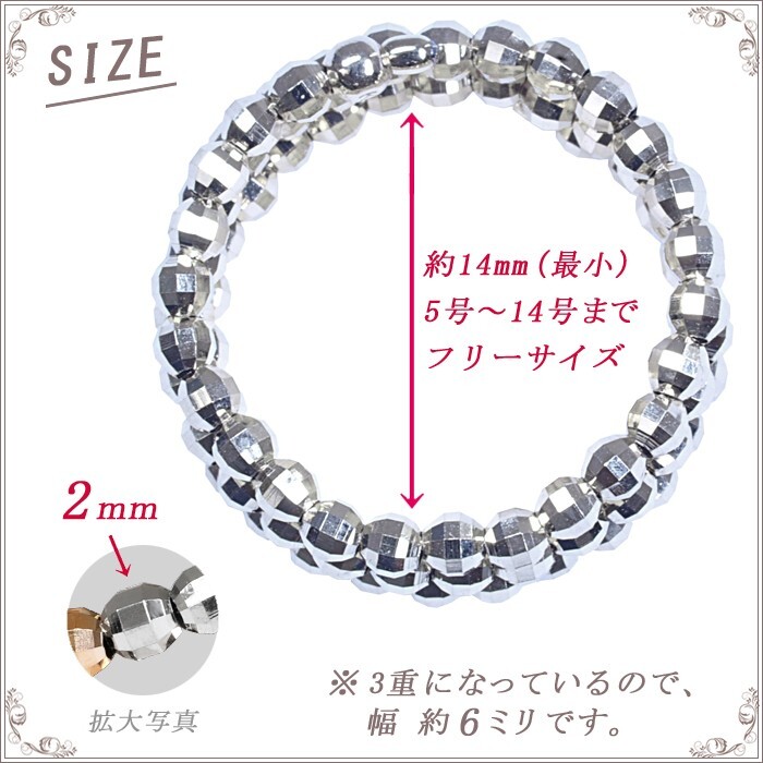 ミラーボール幅 約 2 mm (※3重になっているので、厚み 約 6 mm) リング 直径 約 14 mm ~ フリーサイズ 適応サイズ 5号 ~ 14号が目安です 重量 約 1.2 g前後 (形状記憶合金含む) |
