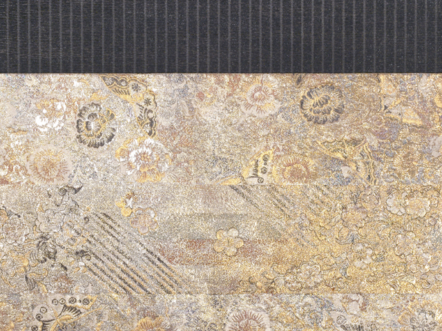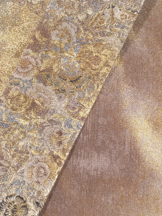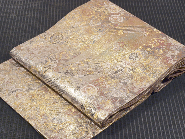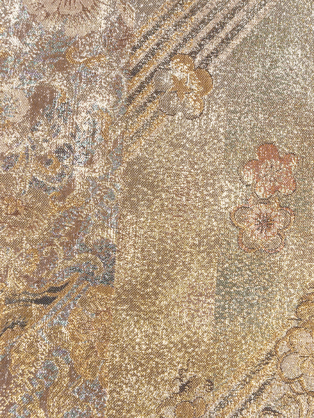 全体的な印象としては金色、淡い緑青色、薄紫色、白色、沈んだ紅色といった感じの地に更紗調の唐花草や蝶などの配されたたて縞の文様が織り込まれている、西陣織の袋帯です。京都・西陣の老舗の織元であった「西陣あさぎ」さん(現在は和装卸元の塚喜商事さんが「西陣織美術工芸あさぎ」として運営)で企画製作されたお品です。 何げなさと上品な趣を醸した意匠で、たて縞で切り替えられたオリエンタルなモチーフにおもしろみが感じられます。千八百ジャガード細緻織によるとても精緻な織りが絢爛たる雰囲気を醸しています。 ユーズド品で、ごくうっすらとした前の折り跡がありますが、使用感はほとんど感じられません。目につくしみやよごれ、褪色などのダメージもなく、とてもきれいな状態です。 |
