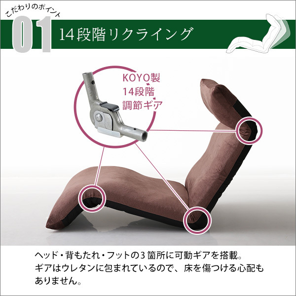 | 【ポイント】 14段階のギアチェンジで絶妙な角度に調整ができるダウンスタイル! しっかりと体を支え、疲れにくい形状になっています。 コンパクトに折り畳むことができるので収納するのにも便利です。 生地はふわふわの起毛タイプとサラッとした通気性のあるメッシュタイプがございます。 |