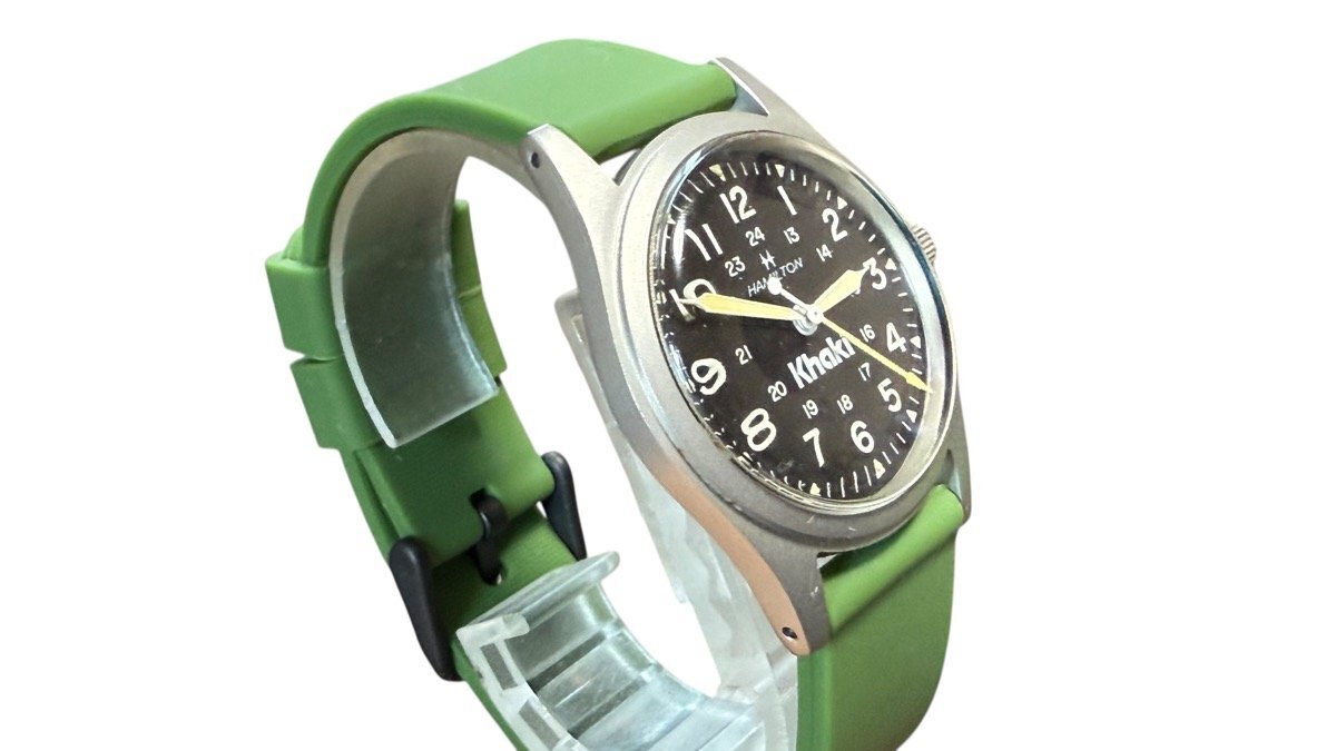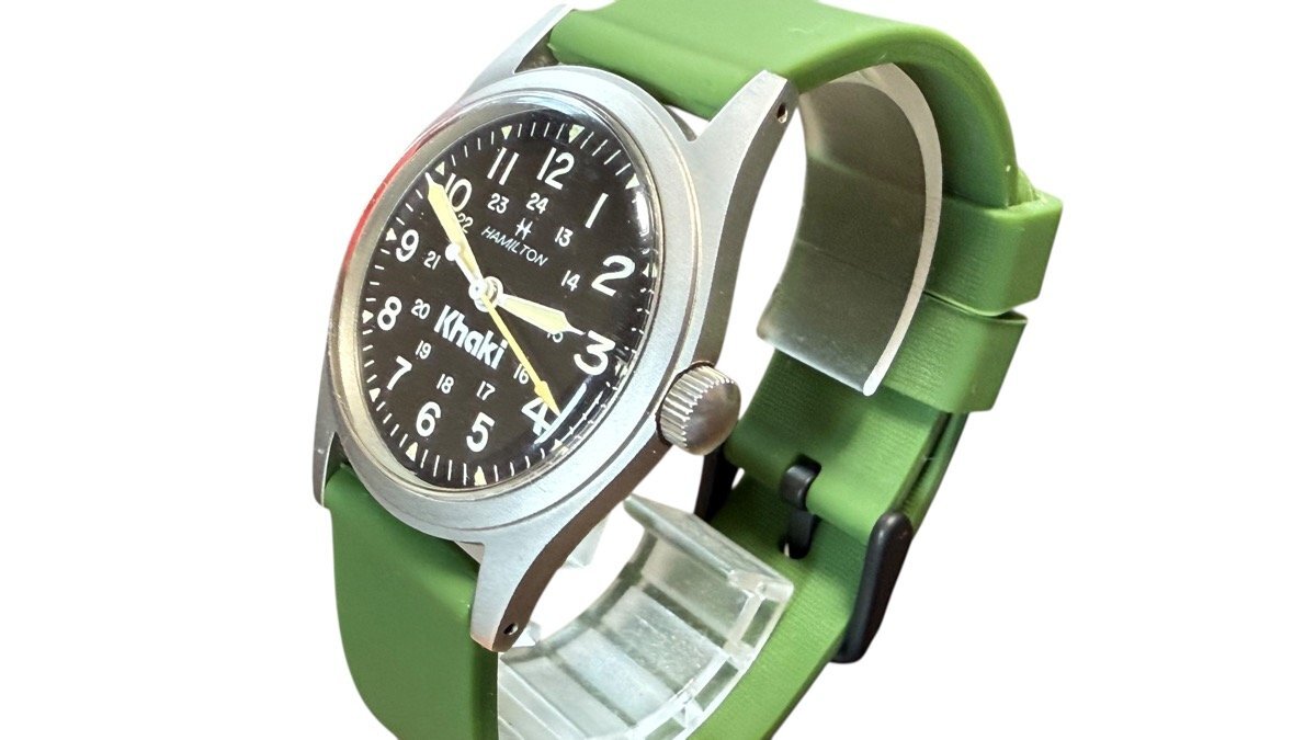 | ご覧いただきありがとうございます! 【ブランド】 ハミルトン 【商品名】 カーキ ハミルトンの腕時計です。シンプルでカジュアルな印象ですが、高級感がありおすすめのお品です! 【ムーブメント】 自動巻き 【サイズ】 フェイス3.3㎝ (リユーズは含みません) 【コンディション】 ランク『S』 補足:動いています。現状でのお渡しです。細かい傷は若干ありますが、とても綺麗な印象のお品です。箱、証明書、替えのベルトが付属します。
