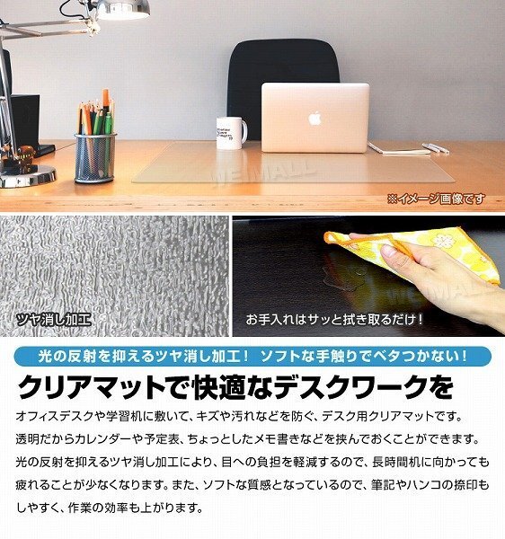 | カレンダーや予定表、メモなど挟めるクリアタイプのデスクマットです。 光学式マウスにも対応しているので、マウスパッドを使用せずにマウス操作ができます。 デスクマット表面にエンボス処理を施すことで、ベタつきを感じさせないサラっとした表面になっています。 また、このエンボス処理は光の反射を抑えてくれる効果も◎! ハサミで簡単にカットができるので、デスクマット以外にも、様々なシーンで使用できます! 【商品仕様】 カラー:クリア サイズ(約):幅60cm×奥行43cm(厚さ1.5mm) 材質:軟質PVC 使用温度(約):−20℃〜50℃ ※お手入れは薄めた中性洗剤を湿らした布につけ、固く絞って拭いた後、水分が残らないように乾いた布で乾拭きしてください。 ※日の当たる所で使用しないでください。日焼けで硬化する場合があります。 |