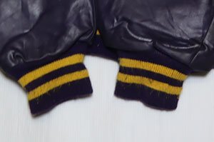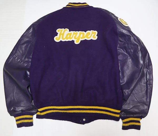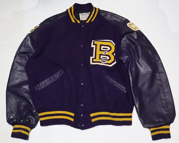 90年代のアメリカ製DELONGの(フェイクレザー袖&ポケット縁)レタード貼り付けスタジャンの紫系の中綿入りです。
