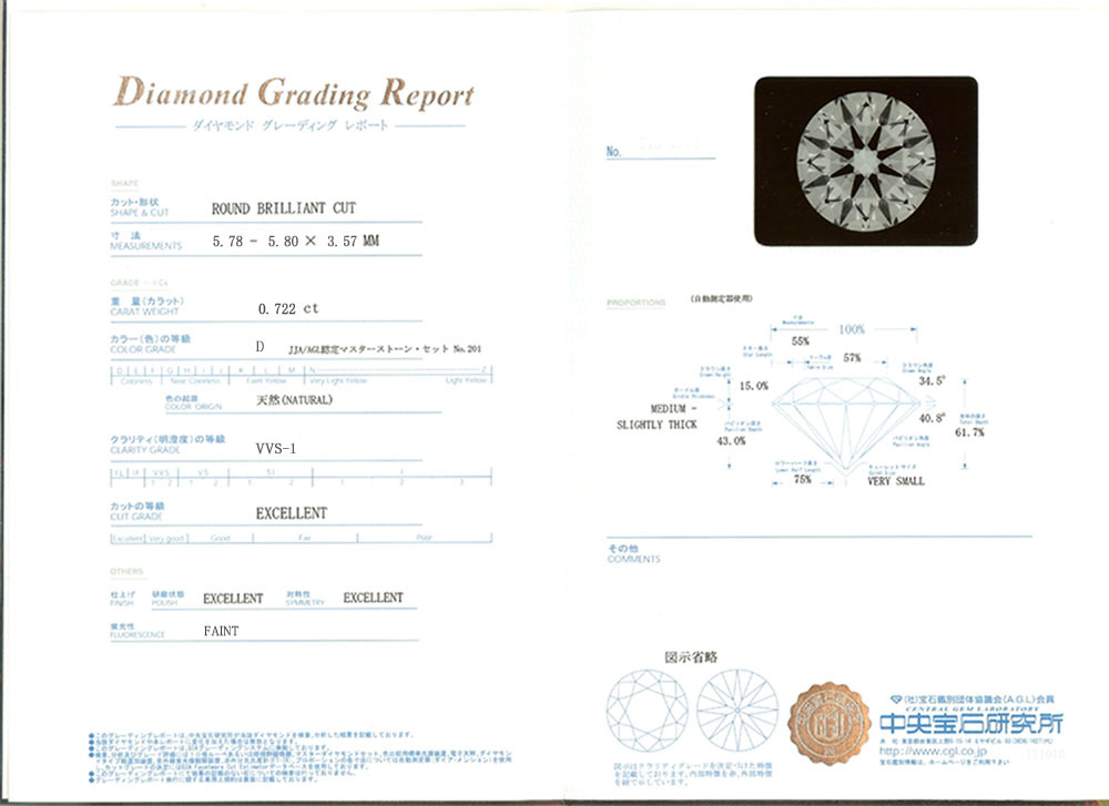 0.722ct カラー:D クラリティ:VVS-1 カット:3EX H&C 中央宝石研究所 3EX H&C DS鑑定書付 |