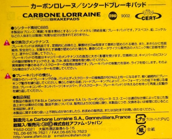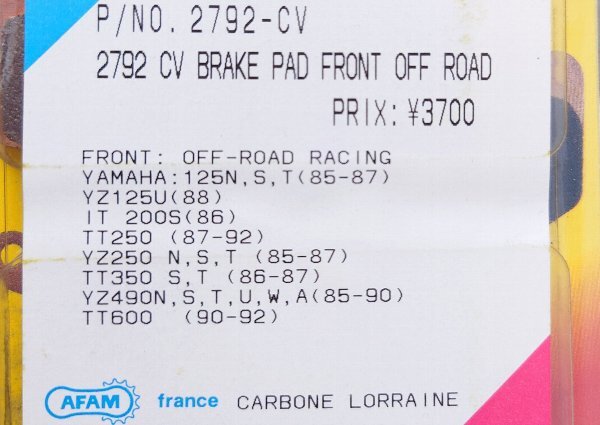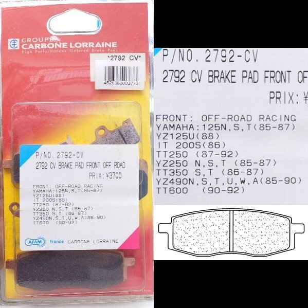 カーボンロレーヌ(CARBON LORRAINE)製のシンタードメタル素材のブレーキパッド(品番:2792-CV)定価4400円(新品)です。パッケージに貼ってある適合車種はTT(250・350・600)、YZ(125・250・490)、IT200S、YZ490、TT600等です。パッド形状も画像に入れておきますのでお間違いの無いようにご入札ください。同品番のパッドを複数枚持っていますので、お送りするのは同品番の製品となります。長期在庫品ですのでパッケージが割れているものも混じっています。中身のパッドは問題ありませんが、パッケージが気になる方は入札をお控えください。<配送途中の事故や不着の補償有り>