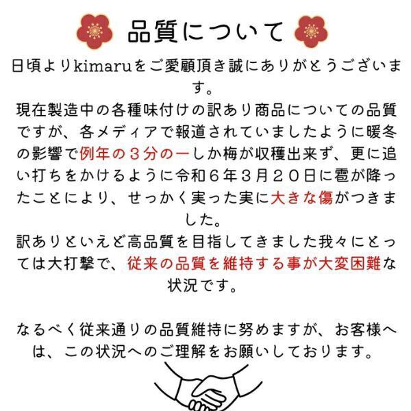 不安がある方は、特上のはちみつ梅各種バリエーションございますので、訳ありではない方をご購入して頂く事をお勧め致します。