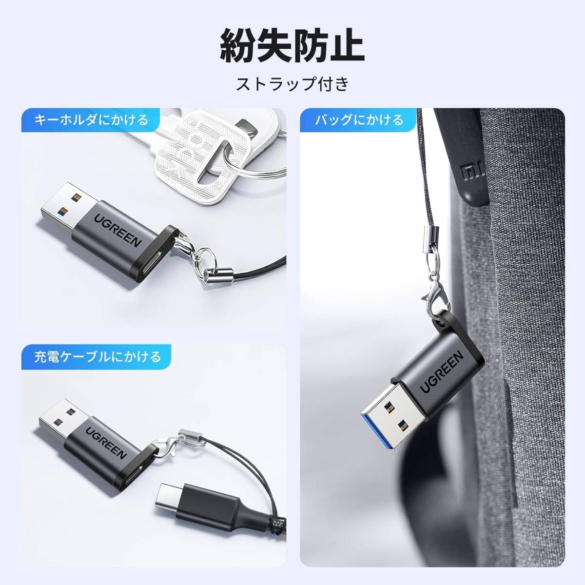 小型で持ち運び可能:わずか35mm*12mmのサイズで、紛失防止ストラップ付いているためUSB変換アダプターをキーチェーンに取り付けて紛失を防げ、スマホ、鍵やいろんなところに掛けられます。小型と軽量で収納しやすくて、旅行中、自宅、職場などで持ち運びが簡単です。