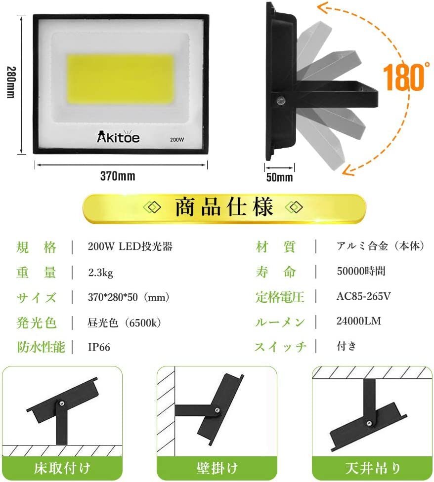 【商品詳細】 ◆軽薄化LED投光器: 2.3KGの軽量だから壁への負担を掛けずに壁掛けが可能、駆動内蔵設計で投光器の厚さはわずか5CMでよりスッキリと設置できます。 ◆高輝度・防眩設計: 高輝度チップを288個搭載しており、抜群な明るさを確保します。発光面が大きいので照射角度も広くなり、より広い範囲を照らすことができます。光学ガラスを採用しており、眩しさを和らげるとともに光の放射を均一にすることができます。 ◆優れた放熱性: 優れたアルミ材質を採用、熱伝道スピードは伝統投光器の2倍以上!ヒートシンクには溝があり、空気とタッチする面積が増大します。 ◆防爆耐震ガラス: レンズは強化ガラスを採用、長期間で使用でもクリアな光を照射し、耐衝撃性が高くて割れにくいです。安定・丈夫な材質で、長時間に使えます。 ◆IP66ラベルの防水性能: 密封性に優れ、IP66相当の防塵・防水性能を実現!場所を選ばず様々な用途の照明に使えます。 ◆照射角度調整可能: 回転支えを使えて、お好みに照射角度を調整できます。 ◆広い使用範囲: 軽量で持ち運びが便利です。車庫、庭、公園、街灯、玄関常夜灯、夜釣り、トンネル、工事現場、舞台照明、BBQ、ガソリンスタンド、夜間イベントなどに適用します。 【保証】 ◆当商品は12っヶ月保証となります。 ◆お届けから1週間以内にご連絡のあった不良品の保証対応の送料は当方が負担いたします。 ◆保証期間内の不良品ですが、交換のみ対応しております。往復送料はお客様負担となります。在庫がない時だけ返金しますので、ご了承ください。 |