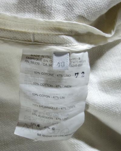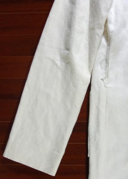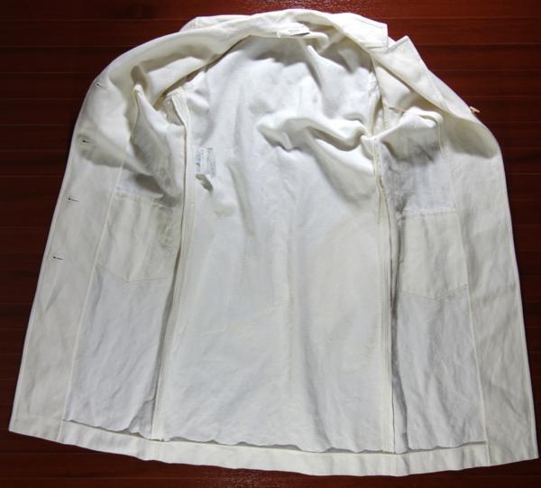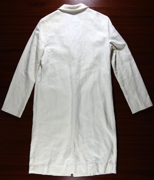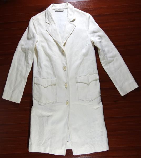 出品は画像の物のみです。使用品ですし色が白いので所々に細かい汚れなど有ります。ベルト通しの紐が片方とれてなくなっています。多少の擦れはあるかと思いますがひどい傷はないです。生地は綿53%、麻47%です。サイズは着丈が96cmくらい、身幅は48cmくらい、肩幅は40cmくらい、袖丈は60cmくらいです。ベルトのサイズは75~87cmくらいの間に穴が5個有ります。