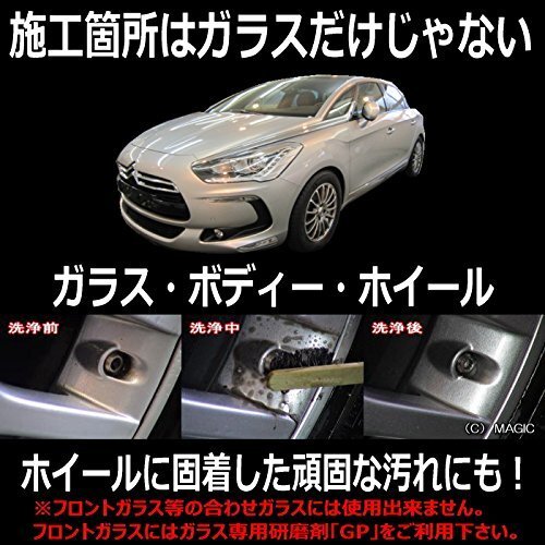 | ほとんどの車両で威力を発揮しますが、作業を数回繰り返しても除去できない場合は、自動車の使用環境や保管環境・その地域の雨の性質などにより「WSC」で分解する事が出来ない成分で出来たウォータースポットが付着している場合が御座います。「WSC」が反応しない成分で出来てしまったウォータースポットは「WSC」での除去は不可能です。その場合には研磨剤による除去方法となりますので別途ガラス専用研磨剤「GP」をご使用下さい。 ※重度のウォータースポットの場合、研磨剤を使用した磨き作業は重労働になる事がありますので、始めから研磨剤を使用して磨くよりも「WSC」で落ちる成分は落とし、落としきれない成分については研磨剤「GP」で丹念に磨き込みます。こうする事で効率よくウォータースポットの除去が出来ます。 もちろん「GP」で丹念に研磨するもよし!「WSC」と一緒に使う事で作業効率のUPにもご利用下さい! |
