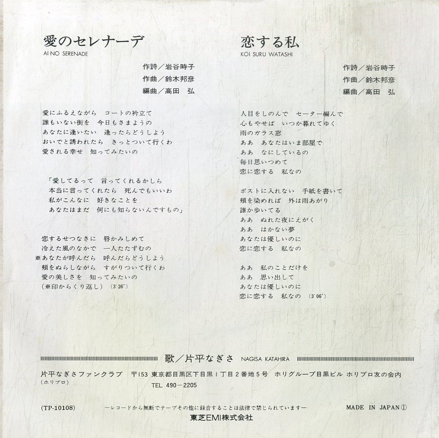 C00184288/EP/片平なぎさ「愛のセレナーデ / 恋する私 (1976年・TP-10108・鈴木邦彦作曲)」