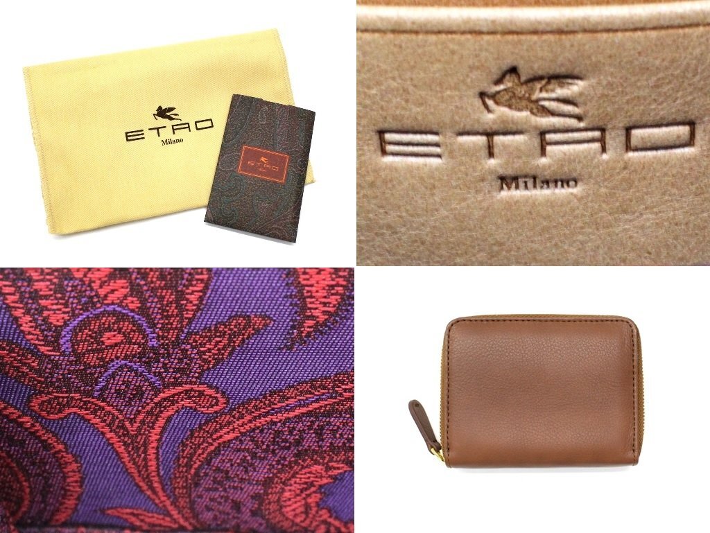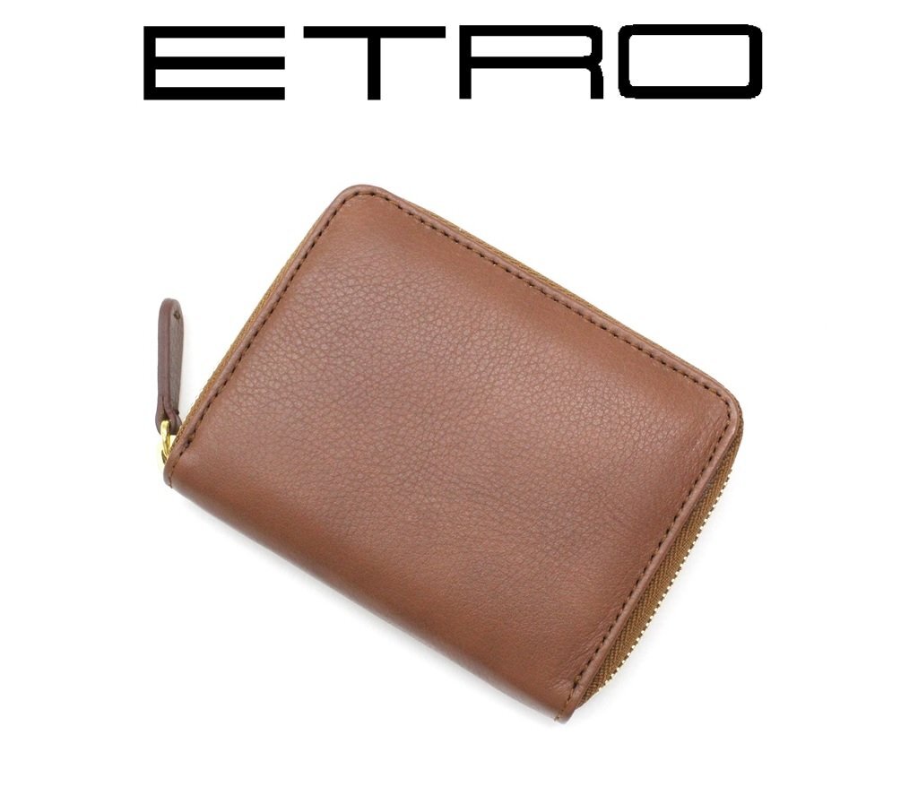 7万新品◆エトロ◆カーフレザー ラウンドジップ型コイン・カードケース 茶【ETRO】